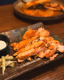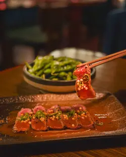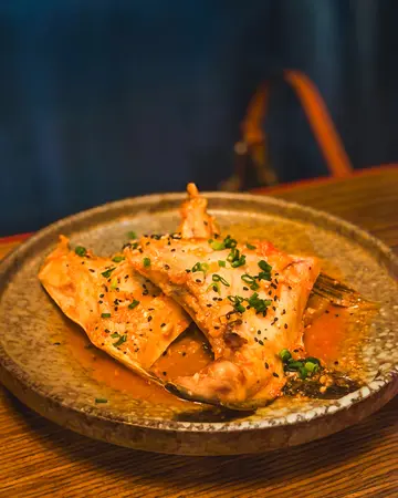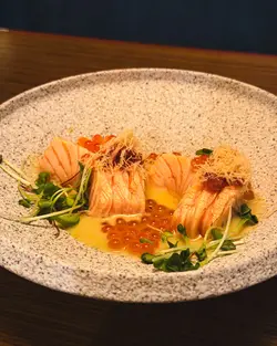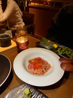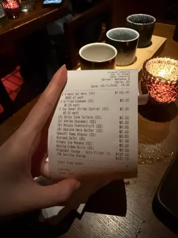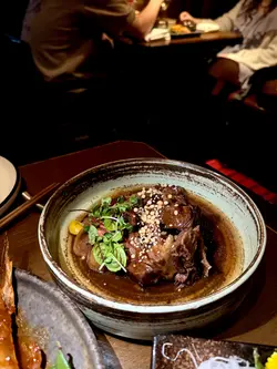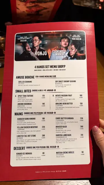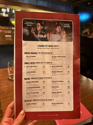 最近留意到《黑白大厨》料理狂人尹南鲁及香港fusion菜餐厅Honjo嘅主厨Kyle联乘推出4 hands晚宴!黑白大厨热潮席卷全球,连带实力派嘅料理狂人都号召力十足🔥Honjo推出嘅 hands晚宴供应至11月尾,而17-19/10就有料理狂人率先现身,好彩比我book到,更可以同两位大厨合照,好开心🥰我睇开料理狂人做韩综《拜托冰箱》固定嘉宾,一直都想试试佢嘅手势😛今次呢个限定menu每位$588,每道菜普遍都唔错,好多都用上新鲜海鲜,性价比几高。不过我食𠮶晚比较full,餐厅分两轮,上菜较快,感觉匆忙咗啲😂4 Hands Menu $580pp前菜🫛烤日本枝豆、酱油甜虾刺身简单嘅开胃前菜,枝豆加入烟熏麻油、海盐及海苔,味道几香。甜虾则只用少许海苔油及大豆鹌春蛋黄调味,突出本身鲜甜味😚小吃🍣辣味吞拿鱼他他、𩽾康鱼肝细卷吞拿鱼他他混合赤身、三文鱼子、切丝面团等,面团做成薄脆,丰富菜式口感,不过辣味就唔系好觉。另一道𩽾康鱼肝卷,骤眼睇以为系海胆🤣入口都几软滑甘香😙加入柚子醋啫喱增添味道层次。🐚帆立贝热情果、牛油香草鲍鱼鲍鱼弹牙兼好向牛油香草味,几突出😋帆立贝则几鲜味,加入咗热情果虎奶酱、刁草及法国芫茜等香草,酸酸咪咪几醒胃👍🏻主菜🐟牛油咖喱银鳕鱼呢道菜系料理狂人呈献嘅招牌菜,银鳕鱼皮脆,鱼肉超级嫩滑鲜味😋酱汁带点咸香及香料香,混入酸豆增添层次,虽则唔系好食到咖哩味,但整体嚟讲味道都几出色🫶🏻🥩栗子炖牛肋条牛肋条份量十足,连住筋位,可以食到筋位浆口嘅感觉兼牛肋肉啖啖肉嘅肉感😽我就觉得可以再腍啲,不过钟意有咬口嘅都ok。牛肋条炆得好入味,酱汁咸甜富层次。面头洒上不少脆米,提升口感👏🏻🦞热石龙虾尾 +$78呢道菜有韩式石锅饭嘅感觉,趁热将饭、龙虾尾及配料拌匀,一边拌一边闻到浓浓嘅牛油香😻龙虾肉鲜甜弹牙,饭带点饭焦,加上恰到好处嘅配菜,整体味道口感都几出色😋甜品🍨黄豆粉最中、抹茶焦糖炖蛋估唔到甜品好出色,起咗画龙点睛嘅作用🌟黄豆粉最中用薄脆嘅最中饼夹住黄豆粉雪糕,雪糕软滑富黄豆香,里面有不少云尼拿籽,香味十足👏🏻焦糖炖蛋亦系上乘之作,薄脆焦香嘅焦糖加上甘醇嘅抹茶味以及唔太甜嘅红豆,配搭出色😋推介指数(10分为满分):8分…查看更多