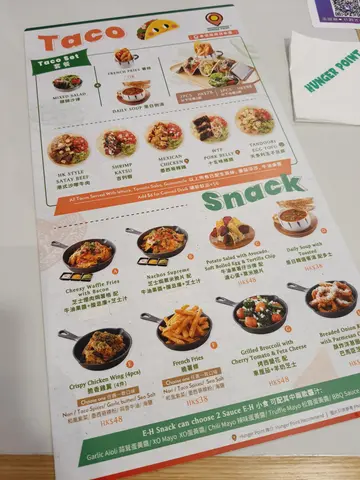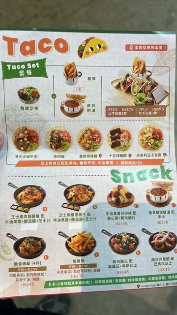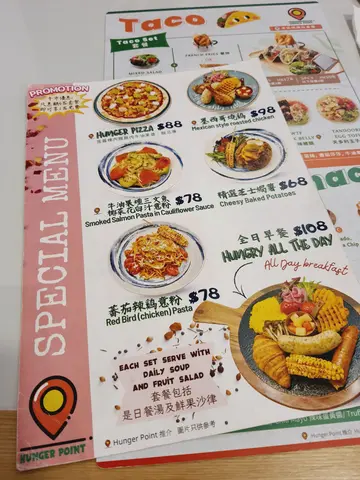 )。换句话讲,如果想试正宗"taco"ge话,呢间未必系您杯茶。"taco"饼皮较细,而且偏硬,但唔算太干。呢次叫ge「吉列虾」同「十五味猪肉」,岩岩都属于偏咸ge内馅,所以配搭"taco"内里ge番茄同青菜,成个"taco"唔会太「漏」,又唔会太「难啃」,算系舒服又唔会太大负担。如果下午茶想试D新奇款式,又唔想份量太多ge话,呢间ge"taco"值得考虑。餐汤系义大利式杂菜汤,同样算舒服。呢次套餐令我稍为意想唔到ge系,居然有少量西瓜作为餐点。可能考虑到而家ge天气。呢间"Hunger Point",无论小店装潢、员工服务态度都令人满意。想简简单单又一餐好餐?"Hunger Point"可以帮到您。…查看更多