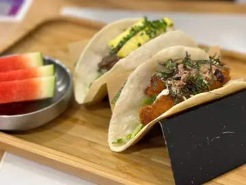 。系小店用QR Code落单个阵,一直系"taco"同薄饼之间挣扎(始终唔想食白饭),最后试左佢地ge"taco"套餐。呢次先试两款"taco"ge套餐。套餐ge"taco",严格黎讲,出左墨西哥辣鸡口味同墨西哥有关连外,其他口味反而属于我地熟悉ge风味:日式「吉列虾」、港式「沙嗲牛肉」等等(抱歉,记忆力较差