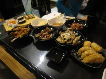 (6) 天妇罗 - 虾叫做最 ok, 但系啲蚝就真系咪试, 厚粉多油, 只蚝仲细过蚝豉...(7) 烧鱿鱼 - 其实超腥嘅卤水鱿鱼(8) 芝士烟肉烧蚝 - 同様, 只蚝 ' 大' 到捃唔到, 好多好多沙律酱走芝士, 唔知点解个蚝壳好黑好黑, 莫非.....咁环保??(9) 火炙三文鱼寿司 - ok(10) 牛肉锅 - 汤多锅大料少....最热嘅一様, 甜甜地, 味道都可以(11) 烧和牛 - 有牛味, 但都系老问题, 唔热....