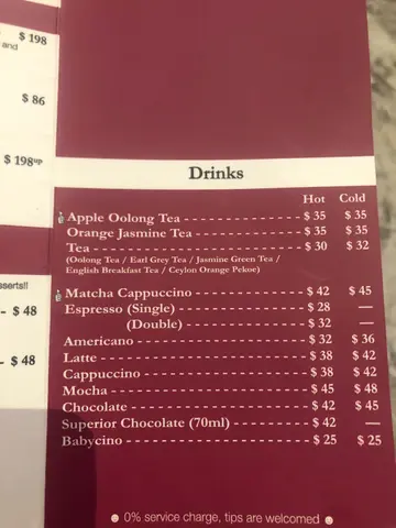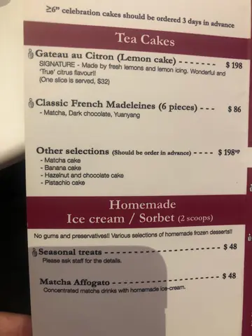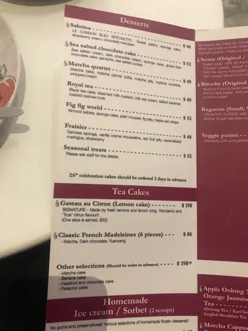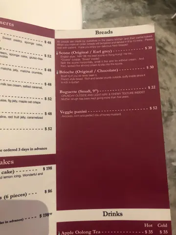 朋友约我去食甜品,先在金钟地铁站等,再行10分钟先揾到呢间稳世的甜品店,完全唔起眼,如果唔系朋友带去,唔知间甜品店系边。白色铺面,里面是有三四张枱,我同朋友坐低,叫咗出名嘅salted chocolate cake and royal tea cake,再加两杯latte咖啡,朋友说厨师是法国蓝带毕业,店舖装修比较法式的,先是我要刺激朋友说厨师是法国蓝带毕业的,店舖装修比较法式的,先试royal tea cake ,超级好味,茶味浓浓的,最奇妙系上层湿下层干的感觉,非常好味。至于朱古力蛋糕,有种岩盐味,所以感觉唔系好甜,食得出有rum酒味,同样好好味。至于咖啡,中尚可接受。未到好impressive!蛋糕就一流。蛋糕每件$52 ,两个人最后二百蚊埋单。值得一去。老板仲好好人,同你倾计。…查看更多