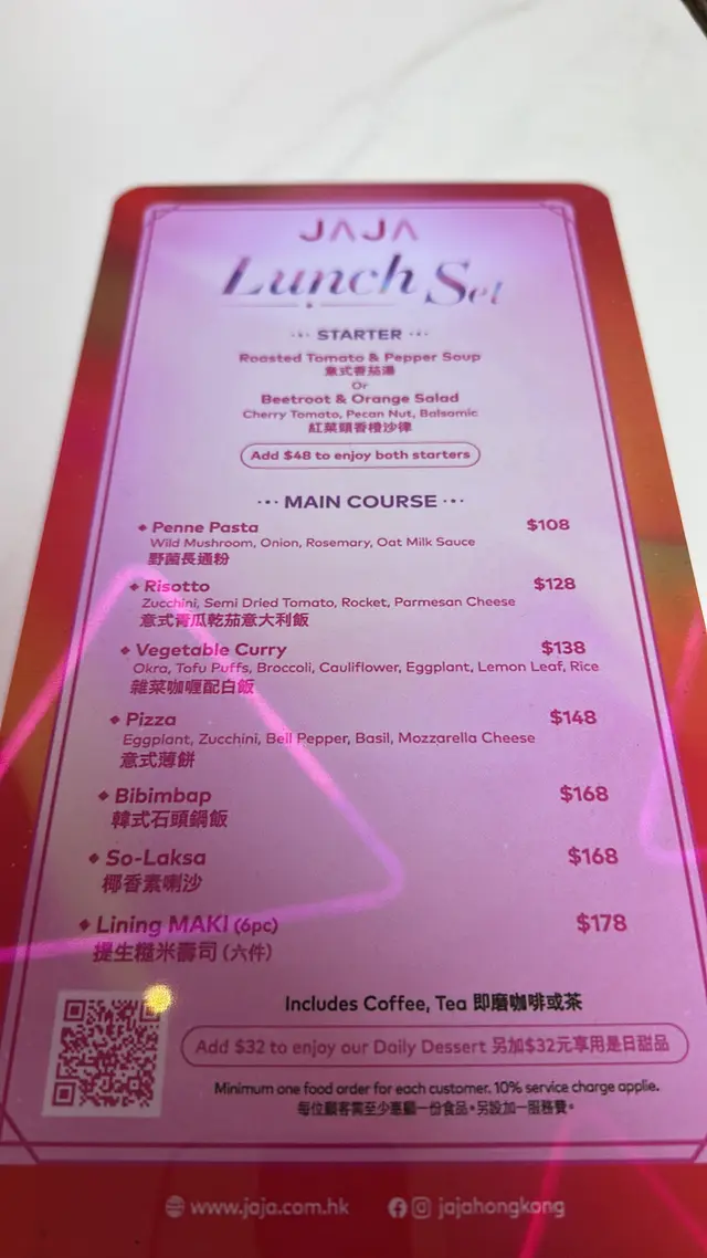 位於灣仔的 JaJa 是一間充滿活力與創意的素食餐廳,裝潢色彩繽紛,pink pink 🌸打卡位十足。餐廳主打健康又美味的植物性料理,如松露意粉和素版漢堡,口感豐富且充滿驚喜。甜品如抹茶蛋糕更是令人一試難忘。整體用餐環境輕鬆愉快,服務熱情周到,是健康飲食和拍照打卡的好去處!🌸🧚♀️✨💛🌟…查看更多