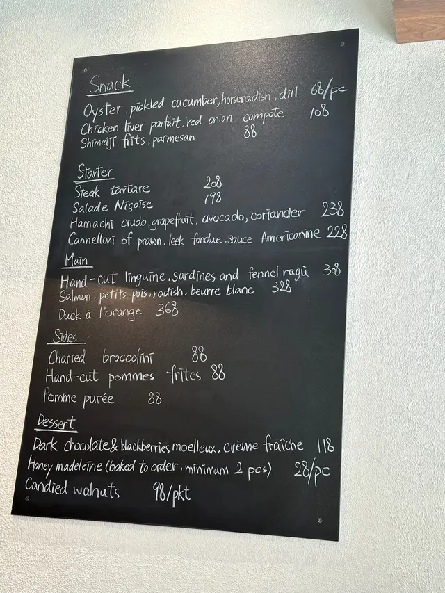 C'est la vie~~(1) Oyster, pickled cucumber, horseradish, dill莳萝气味温和辛香、辣根(即另类Wasabi)辛辣霸气冲天,配上酸黄瓜澄清成翠绿无暇的酱汁。能够撇去海鲜附有的腥味,突出本身鲜甜、滑嫩口感。酸甜酱汁,清爽口感唤醒味蕾。(2) Steak tartare虽是一款法式小酒馆的家庭料理,但主厨非常擅长将酸味(酸豆、酸黄瓜、红葱、蕃茜)引发香味。蛋黄润化并包裹着迷你小方块的牛肉,加上薄脆多士,轻松入口,挑起嗜食的欲望。(3) Duck à l'orange法式鸭胸镇店菜式。鸭肉尚算粉嫩但稍嫌overcooked.口感既有弹性又紧实,烤红萝卜、红萝卜姜泥配合香料蜜糖汁,脆嫩相济,咬啮间释放浓郁鸭香。(4) Duroc pork chop, courgette, jus (bone-in, 45 minutes)Special menu: Duroc pork 会译成「黑豚」但不是真正的黑毛猪。肉质鲜嫩、油花丰富,口感较为柔滑而富有自然甜香,味道亦相对浓郁。小胡瓜及酱汁都充分利用猪扒余下的肉汁而制成。整道菜式慢煮慢制,没有煎烤焗令菜式更加和谐,脂肪比例2:8,没有干柴感,突题原材料的天然风味。但如果不嗜猪,会略嫌调味单调,酱汁淡薄。(5) Choux pistache, sauce chocolat外壳金黄松脆,内里酥脆轻盈。顶层如薄雪细沙的糖霜,随即融在口中,咀嚼间化为细腻香气,开心果与奶油柔软甘美,口感曼妙。踏入Version 3.0,长摊长有。🍎🫶🏻🫶🏻…查看更多