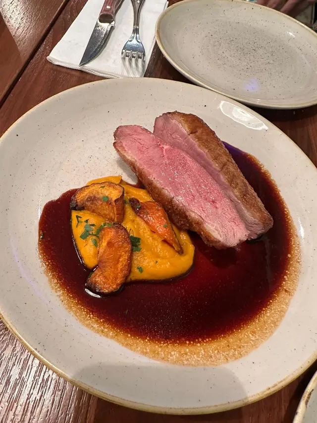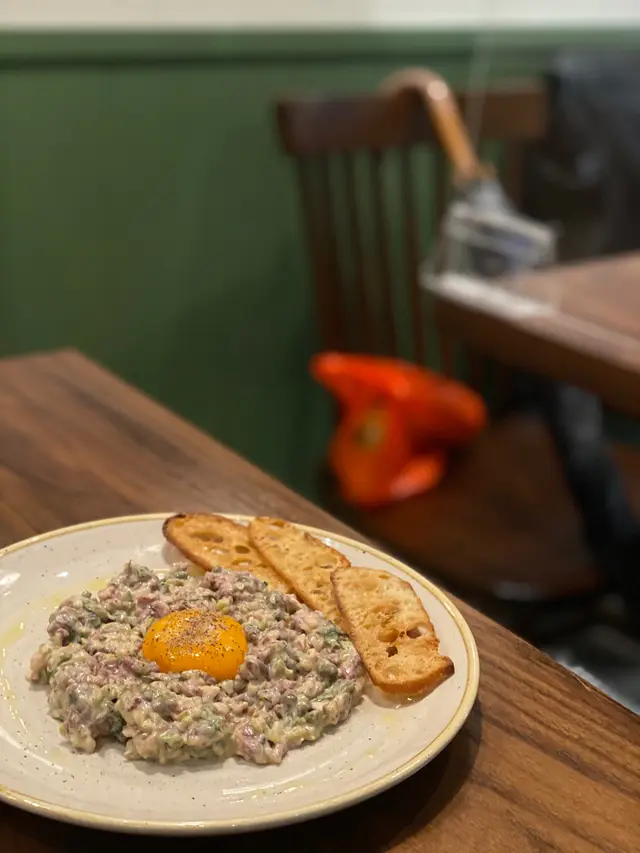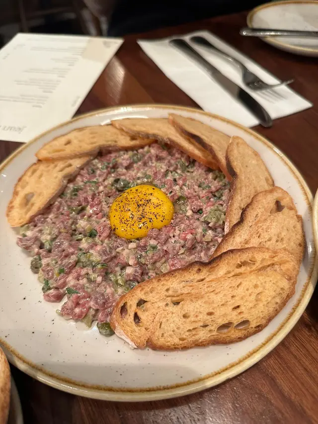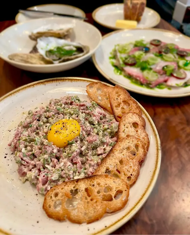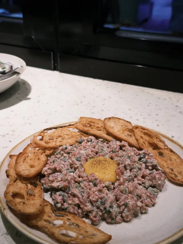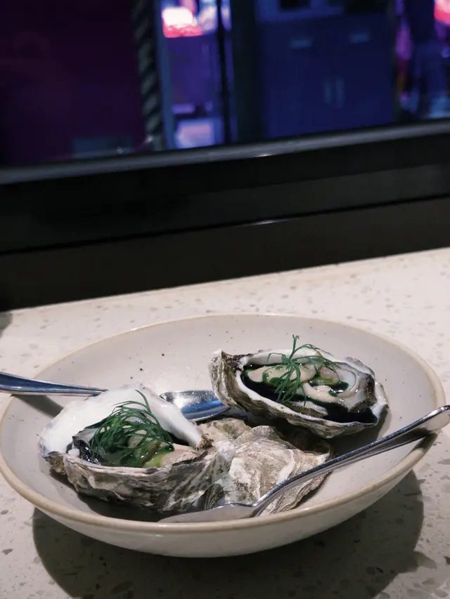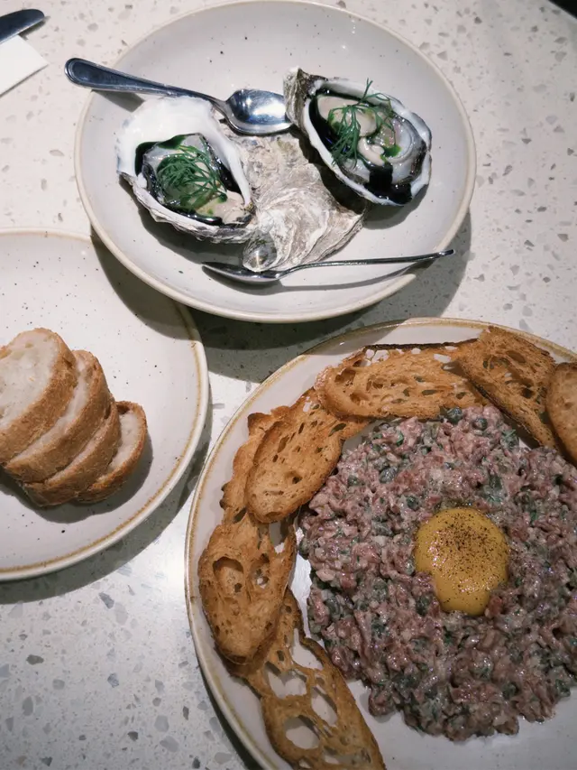 C'est la vie~~(1) Oyster, pickled cucumber, horseradish, dill蒔蘿氣味溫和辛香、辣根(即另類Wasabi)辛辣霸氣衝天,配上酸黃瓜澄清成翠綠無暇的醬汁。能夠撇去海鮮附有的腥味,突出本身鮮甜、滑嫩口感。酸甜醬汁,清爽口感喚醒味蕾。(2) Steak tartare雖是一款法式小酒館的家庭料理,但主廚非常擅長將酸味(酸豆、酸黃瓜、紅蔥、蕃茜)引發香味。蛋黃潤化並包裹着迷你小方塊的牛肉,加上薄脆多士,輕鬆入口,挑起嗜食的慾望。(3) Duck à l'orange法式鴨胸鎮店菜式。鴨肉尚算粉嫩但稍嫌overcooked.口感既有彈性又緊實,烤紅蘿蔔、紅蘿蔔薑泥配合香料蜜糖汁,脆嫩相濟,咬嚙間釋放濃郁鴨香。(4) Duroc pork chop, courgette, jus (bone-in, 45 minutes)Special menu: Duroc pork 會譯成「黑豚」但不是真正的黑毛豬。肉質鮮嫩、油花豐富,口感較為柔滑而富有自然甜香,味道亦相對濃郁。小胡瓜及醬汁都充分利用豬扒餘下的肉汁而製成。整道菜式慢煮慢製,沒有煎烤焗令菜式更加和諧,脂肪比例2:8,沒有乾柴感,突題原材料的天然風味。但如果不嗜豬,會略嫌調味單調,醬汁淡薄。(5) Choux pistache, sauce chocolat外殼金黃鬆脆,內裡酥脆輕盈。頂層如薄雪細沙的糖霜,隨即融在口中,咀嚼間化為細膩香氣,開心果與奶油柔軟甘美,口感曼妙。踏入Version 3.0,長攤長有。🍎🫶🏻🫶🏻…查看更多
