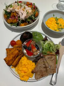 呢一份All day Breakfast卖相都不错,有酸种面包、炒蛋、烟熏三文鱼、牛油果、大啡菇同烤蕃薯,望落好想即刻试🥳 食落三文鱼烟熏香浓,唔会太咸👍🏻 酸种面包香脆,里面软熟,炒蛋嫩滑少油,健康又好食😋 牛油果新鲜,蕃薯甜香绵滑,每样配料都好有质素,味道同口感都好平衡!健康同好食并存🥰