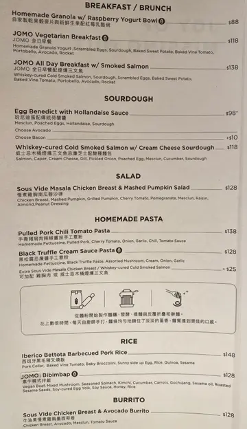 慢煮鸡胸南瓜蓉沙律个卖相好吸引😋色彩缤纷,有丰富配菜,鸡胸侧边有沙律菜、车厘茄、红石榴、提子干同杏仁片,全部都铺得好满,望落好健康🥰 食落鸡胸慢煮得嫩滑多汁,唔会干柴😍 南瓜蓉绵密甜香,微甜嘅酱汁同沙律菜好夹,食得出新鲜同用心🤩 份量适中,好适合健康饮食,价钱喺太古少贵但质素ok! JOMO 全日早餐配烟熏三文鱼 ($138)