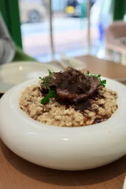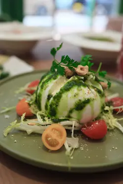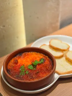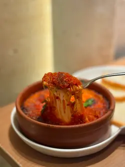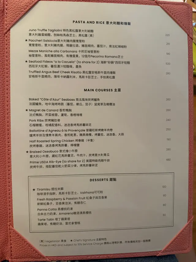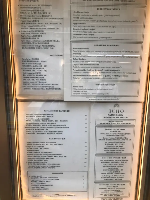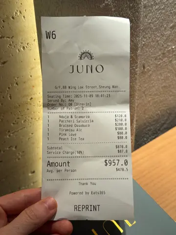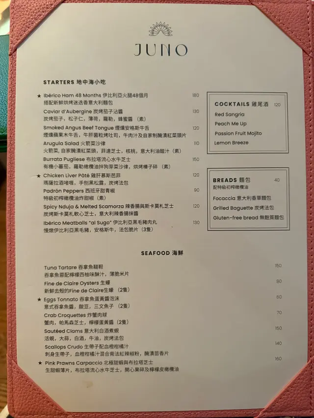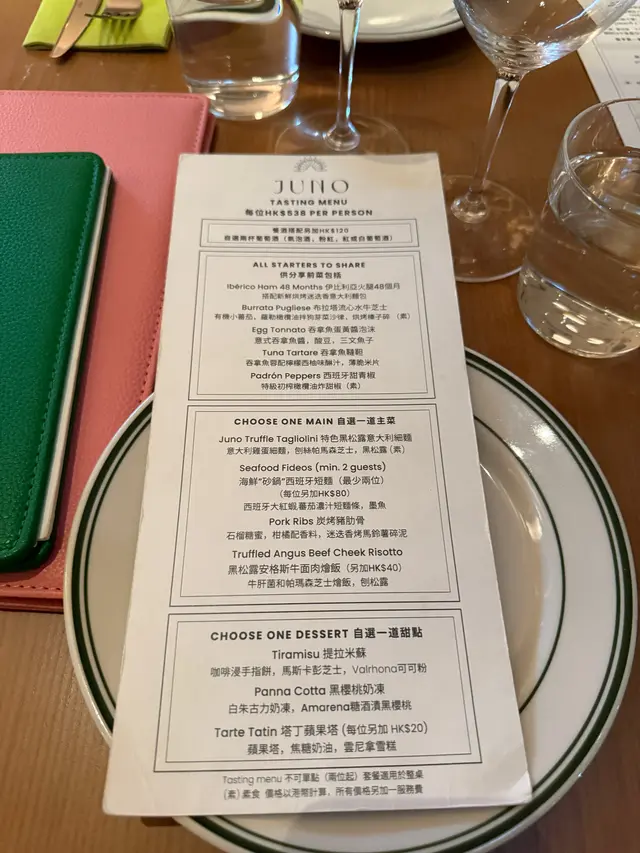 好友为我庆祝生日,悉心安排了位于上环,揉合地中海风情的时尚意大利餐厅「JUNO」享用晚餐外墙以夺目绿配搭高贵金线条,大气高贵又富时尚感,室内则用上橄榄绿及粉色系,加上大理石料理桌、绒面沙发座椅,环境氛围绝无可挑剔之处;主厨来自巴塞隆拿,餐厅更荣获 2025 年米芝莲「必比登」推介-🔹辣香肠与斯卡莫札芝士 $120炭烤斯卡莫札软心芝士及意大利辣香肠抹酱,配上四件脆法包好客的男店员私心推介;果然不令人失望,芝士被烧至焦面,外脆内软糯,做到强烈拉丝感;芝士有著浓郁的咸香与奶香,配搭番茄风味的辣肉肠抹酱,口感丰富也能减低芝士的腻感-🔹意大利猪肉肠宽管粉 $210宽管意粉、意大利猪肉肠、玛萨拉酒、猪面颊肉、蕃茄汁及南法红辣椒粉主厨特色推介;首尝这个宽度的意粉,感觉有趣,口感绝对做到 Al Dente,非常喜欢及欣赏;猪面颊肉充满脂香感,软嫩有弹性,配搭集咸酸辣于一身的酱汁,层次分明又滋味-🔹意式烩小牛膝 $280意大利小牛膝、藏红花马铃薯泥、牛肉汁,及炭烤意大利青瓜主厨特色推介;摆盘用心精致,牛膝面铺上嫩甜多汁的意大利青瓜,再以香滑细致带温雅藏红花香的马铃薯泥围边;小牛膝肉嫩软腍带著浓郁的牛骨香与胶质,味道鲜美,令人满意-🔹提拉米苏 $100咖啡浸手指饼、马斯卡彭芝士、Valrhona 可可粉主厨特色推介;朋友预约时告知为朋友庆生,餐厅为客人提供写字及即影即有服务,很加分!正宗意大利做法,口感滑顺湿润;松软的手指饼配搭浓香马斯卡芝士,入口即化,带咖啡醇厚、可可粉的微苦、芝士奶香及馥郁酒香,层次丰富且分明-🔹PINK LOVE $80Cranberry Juice, Lemon Juice, Fresh Raspberry贴心在饮管上端套上包装,确保卫生,超贴心!酸甜平衡又新鲜的红莓、覆盆子及柠檬配搭得宜,甜度不高-🔹PEACH ICE TEA $80Peach Tea, Lemon Juice, Fresh Mint阵阵桃香与柠檬汁及薄荷的结合,清雅天然…Read More