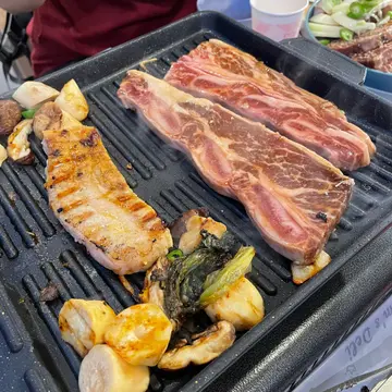 大推介🐮酱腌牛肋骨二人份($288)😋👍🏽 5块牛仔骨十分大块😍 腌制酱料味道非常好😋 伴有洋葱、芽菜、菇类、青椒、同萝卜🐷黑毛猪二人份($538) 猪腩肉都好大块,不过尚未完全解冻,啱哂同朋友相聚时一边倾计,一边慢慢烧😆 伴有黄豆粉同两款酱料、生菜同大蒜,用生菜包住生蒜同烧肉一齐食,味道辣辣地,别有一番滋味😋🐥炸有骨鸡件($228) 拣咗配蜜糖芥末同辣味酱油,配有🥗沙律、🍟薯条、薯格、腌青瓜,炸鸡味道都不错餐厅座位比较窄,4人枱唔太够位摆放4人份食物