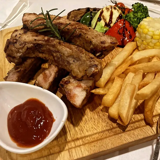 星期六帶小朋友出去通常都會揾親子餐廳,小朋友有得食有得玩,大人有大人傾計,簡直一舉幾得。呢到環境好大,室外有個打卡位,而家天氣温度坐室外都岩岩好。串燒拼盤煙肉荔枝串煙肉香口,荔枝香甜多汁;霜降牛排粒牛肉味道濃郁;泰式豬頸肉肉質嫩滑有咬口;薯條熱辣辣香脆可口;鷄肉串肉質嫩林;燒魷魚入口爽脆。Pizza Hawaiian材料有自家製有機蕃茄醬,水牛芝士,意大利火腿,菠蘿,蕃茄醬酸酸甜甜,芝士濃郁,意大利火腿鹹香味適中,菠蘿非常香甜,餅底煙靭可口。意式燒走地雞半隻配多色有機時令烤菜雞肉非常嫩滑,外皮香脆,一咬開好多汁,烤菜有香甜粟米,爽口西蘭花和翠玉瓜,酸酸甜甜車厘茄。蘋果汁香甜,小朋友最中意飲。…查看更多