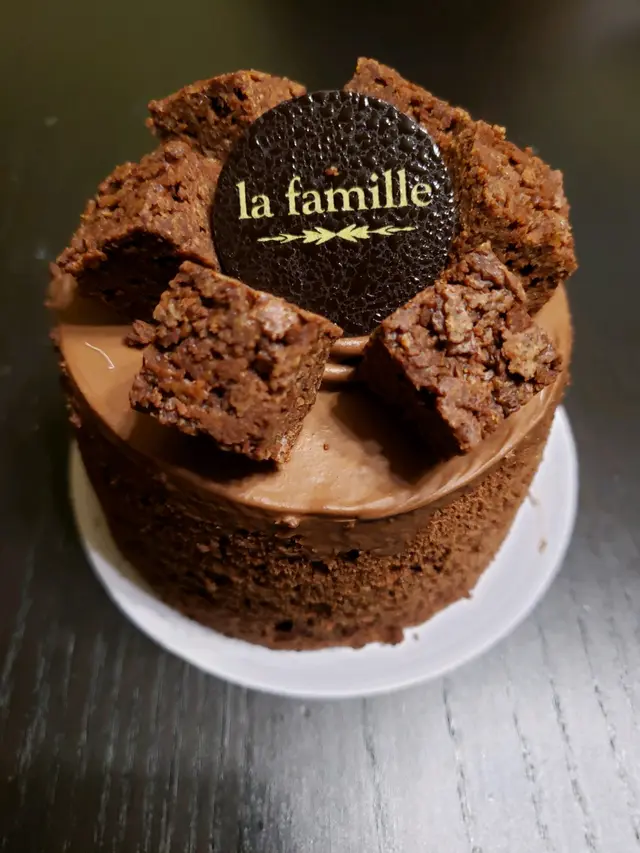 今日在沙田港鐵站的la famille 買了一個雙重朱古力蛋糕,10cm迷你型,每個$60。這間蛋糕專賣店有十多款蛋糕選擇,每款賣相都很吸引,而且每個蛋糕都有獨立圓拱形的透明陳列罩,罩頂有一粒鑽石形的扭,令蛋糕顯得份外精緻。雙重朱古力蛋糕的朱古力味夠濃,甜度適中,蛋糕的口感鬆軟,蛋糕面上有6粒朱古力脆脆,好好味。單個裝蛋糕的純白色高身包裝盒也很美觀。查看更多