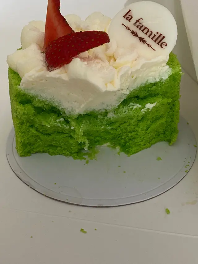 終於說服到🤴🏻肯俾我買La Famille嘅蛋糕🍰,但條件係每個月只可以一次同埋唔可以重複😂😂!好!應承你!😊😊~~~斑斕飄香~~~時間已經係晚上七點幾賣剩嘅蛋糕🍰冇乜幾個其中一個係我鍾意嘅口味 ‘ 斑斕 ’ ,呢個蛋糕🍰係我買返屋企第二日先食嘅,本來諗住口感會差少少,但驚喜係質感依然好好👍🏻👍🏻,仲好有戚風蛋糕🍰嘅彈性同質感😘😘,唔止蛋糕🍰有班蘭味,上面所配嘅綠色朱古力🍫斑斕味更濃😙😙,食完🤴🏻好滿意😋😋~~~西瓜🍉玫瑰🌹巴伐利亞~~~返屋企已經有少少溶溶地,不過亦唔影響佢嘅口感,成個造型幾靚,但講明係西瓜🍉玫瑰🌹我以為裏面會有相對應嘅生果!但只有其他生果、花瓣襯托😀😀,有少少甜同時有少少玫瑰🌹苦味嘅啫喱,但係感覺唔到有西瓜🍉味🤪🤪查看更多
