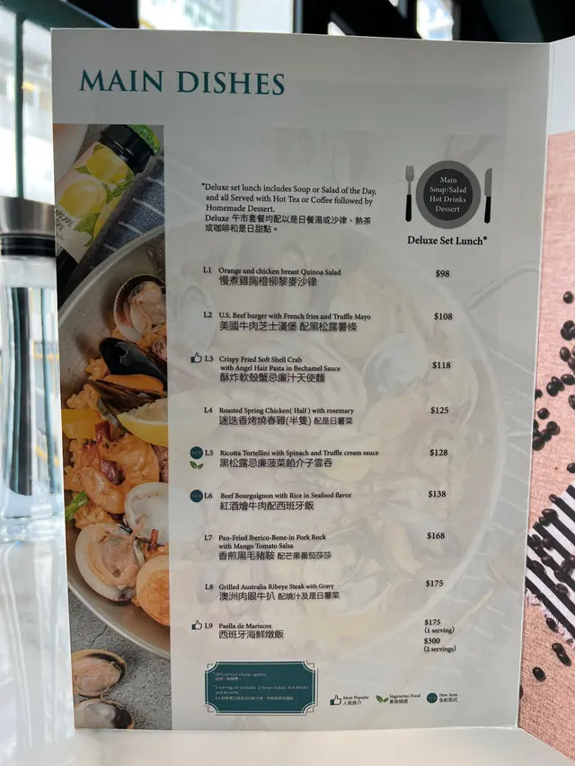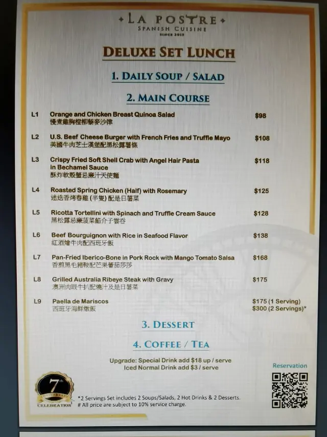 今日去完上環開會兩點幾先完,本來諗住返天后先食晏,但行到永樂街近地鐵站見到CS TOWER樓下有幾支BANNER,一間感覺上係酒吧,另一間係西班牙餐廳,而且見D午餐都幾多選擇加上價錢唔貴,就上去試下,她們在3樓叫LA POSTRE,睇個名估計佢哋主打甜品掛。可能已過午餐時間,在場淨番幾枱客,最終她們安排咗張窗口卡位,一個人坐哂將4-6人位有D唔好意思。問佢哋重有無午餐,她們說午餐供應到5:00PM,睇完餐牌揀咗份Paella,問佢哋餐飲可唔可以轉House White,佢哋話可以補錢轉,服務都好有彈性。份Paella份量很足,所有海鮮都彈牙及夠味,而個飯底不會太乾或太濕,而且有海鮮味道,真係幾好。而杯House White是澳洲的,入口帶點甜味,味道亦Okay易入口的,最終再散叫多兩杯,原本想再散叫份聖地牙哥蛋糕試下,但她們的Paella真的有D份量,真係飽下次有機會再試。環境氣氛舒服休閒,她們的員工亦不會一見我停手了就趕住收嘢趕客,因為當時見她們其實是開始員工用膳時間,服務員是主動過嚟話我可能慢慢享用,唔急的有需要叫佢哋就可以,服務感覺很好,我才放心睇埋套劇。查看更多