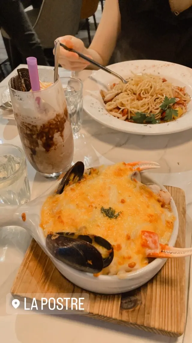 剛過咗Probate約咗Mentor請佢食晏答謝下佢,上嚟見到依間La Postre就喺公司附近,睇埋份午餐Menu價錢又唔貴 (對比其他似樣D嘅餐廳),直接喺Openrice Book埋位有折又唔洗等,上環食晏周圍都要等位真係煩,就Book依間試試。可能係提早Book,佢哋留咗個角LOK梳化位比我哋兩個人,雖然左右兩邊都各有一枱,但比較位正中間那排位,已經很寛敞了,佢哋午餐時間都多人下,中間見到有幾枱客可能無BOOK位,上到嚟都已經滿座了。Mentor叫咗西班牙海鮮飯套餐,我就叫咗份軟殼蟹天使麵套餐,另外加咗份抺茶麻糬窩夫。埋單都係$423,而佢哋嘅午餐有齊湯或沙律、主菜、甜品及餐飲,而且主菜份量都好大份,足料夠味,特別係軟殼蟹是完隻的,而份海鮮飯海鮮亦很足,而份抺茶麻糬窩夫相對嚟講就無乜驚喜,正常嘢。但整體嚟講價錢、環境、食物等各方面,我個Mentor同我都覺得好滿意,原來我個Mentor喺公司做咗幾年,今次都是第一次嚟依度食,佢都話以後都會再嚟。請人食飯最緊要對方都滿意,感覺自己今次選擇很正確。😃查看更多