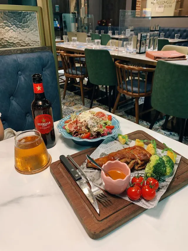 之前已經食過呢間西班牙菜位於尖沙咀厚福街既分店😂前排等朋友收工見上環都有分店決定再訪,環境好舒適,好岩一大班朋友gathering😚_ 🥗黑毛風乾火腿火龍果黎麥沙律 $108今次都叫左個沙律refresh一下😝黑毛風乾火腿帶鹹香,配上清甜既火龍果好開胃,黎麥高纖同時低脂,感覺更健康☺️ 🐷12小時慢烤西班牙乳豬伴焦糖菠蘿 $298作為主打招牌果然冇令人失望,外皮好香脆,肉質保持嫩滑,食既時候仲有肉汁😀配埋特色醬汁有助減低油膩感,值得一讚個焦糖菠蘿同蕃茄仔都好甜,配搭得宜🍍 🧇抹茶麻糬窩夫 ($88/Half or $128/Whole)聽聞餐廳既窩夫好出名,所以叫左半份試吓,份量以食完正餐後已經好充足💜 麻糬好煙韌,外皮香脆,配上抹茶好夾🍵 🍺Estrella $42 今次都叫左1枝西班牙啤酒試下,味道都好易入口,重小麥香🤓一枝係一杯既份量大家可以同朋友飲番杯Chill下😉查看更多