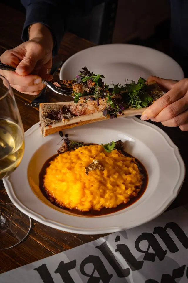 Risotto Milanese, saffron, parmesan cheese, butter + roasted bone marrow