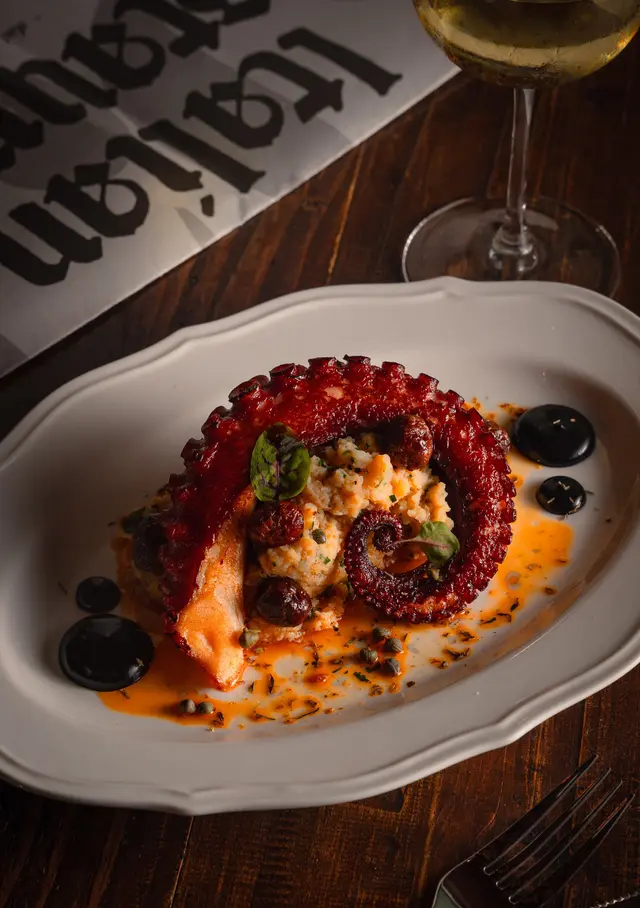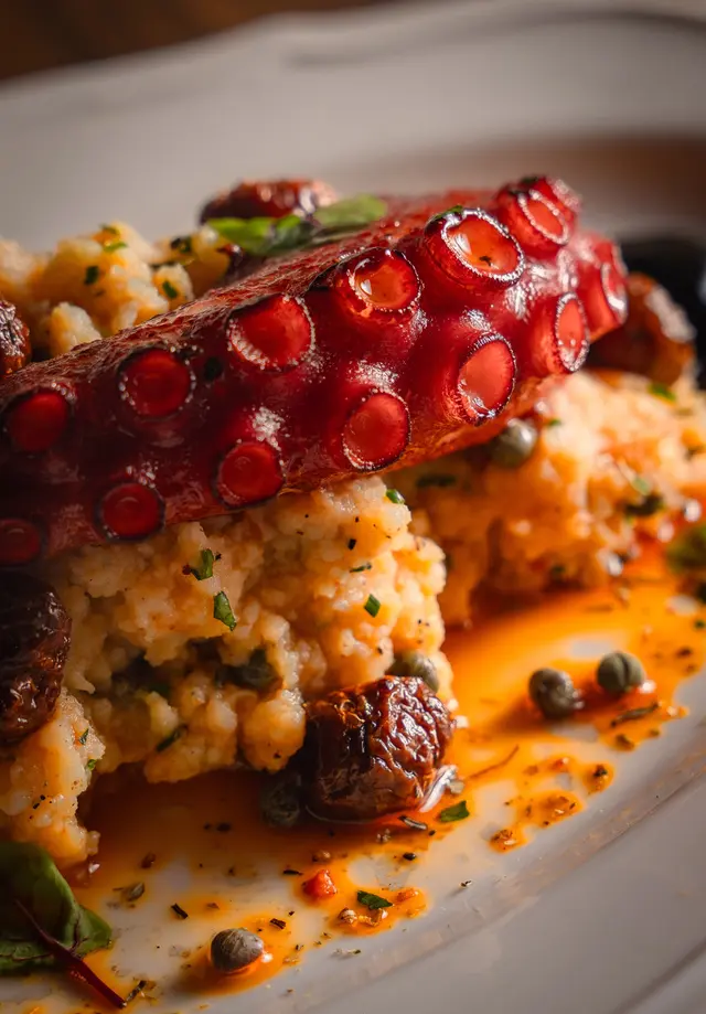 Pan seared octopus leg, potatoes, ndujia, olives, capers