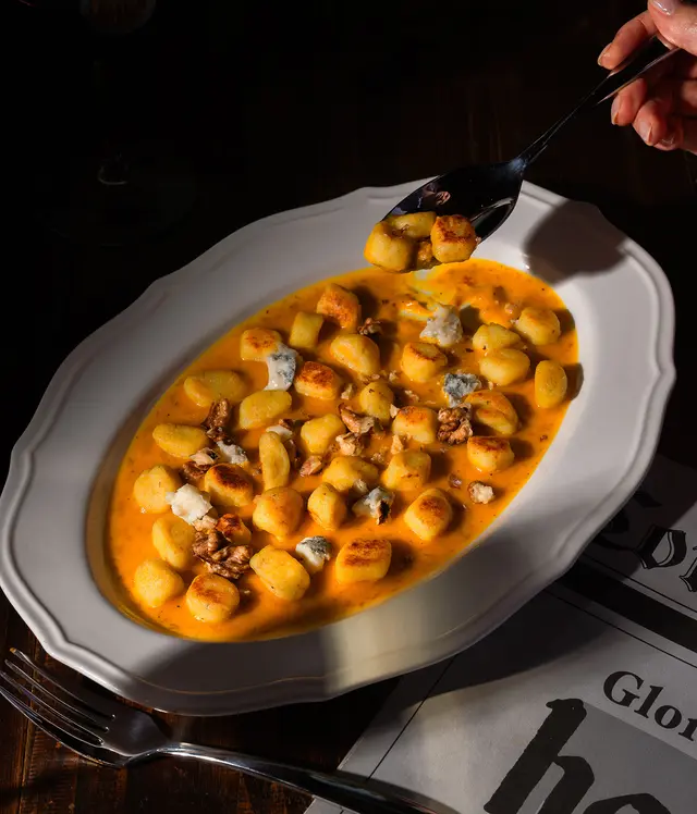 Handmade potato gnocchi, pumpkin & truffle cream, gorgonzola, pine nuts