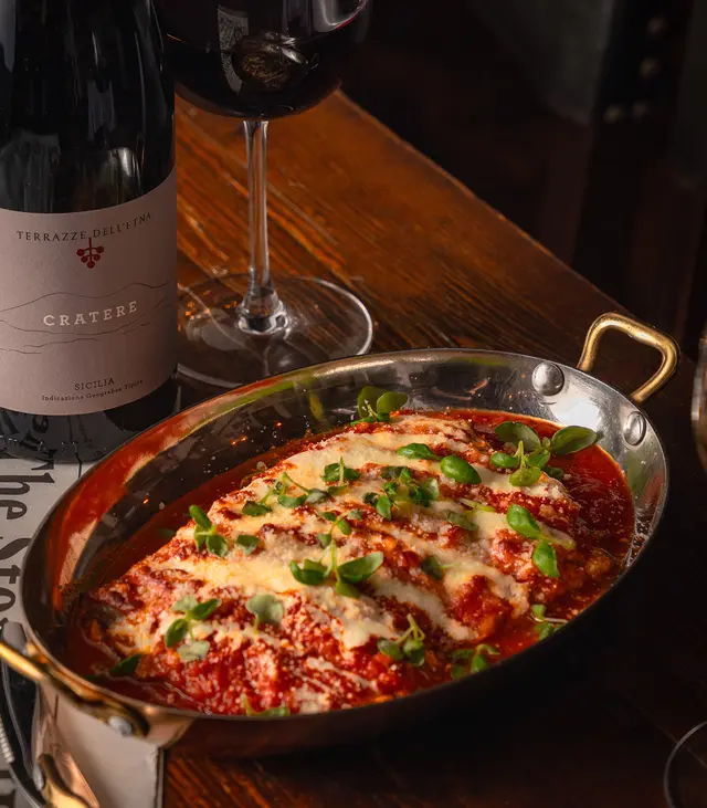 Eggplant parmigiana, tomato, mozzarella, parmesan cheese