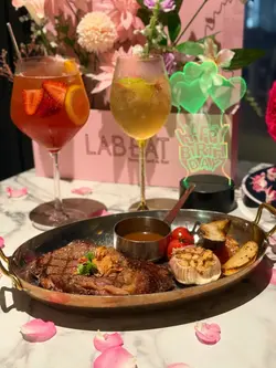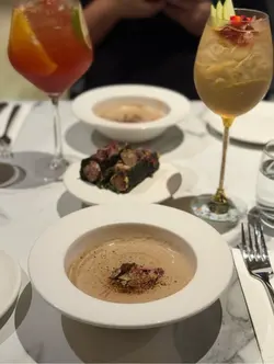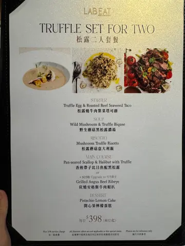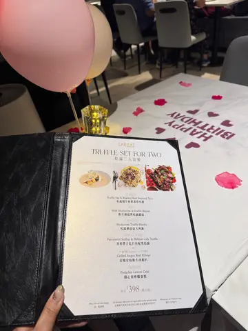 闺密生日我预早订了呢间餐厅同佢庆祝,一入到去就见到张枱布置得好靓,有专属花盒、玫瑰心心、铺满鲜花花瓣,浪漫气氛仪式感满满💯,甜品仲可以画碟,寿星女见到史迪仔开心到飞起!✨✨松露二人套餐✨✨💫前菜- 松露烧牛肉紫菜塔可饼|脆卜卜的紫菜包住粉嫩烧牛肉、蛋沙律,一咬落去就闻到好香嘅松露香气,作为开场前菜很适合。💫汤品- 野生蘑菇黑松露浓汤|一上枱已经闻到好香,喝得到磨菇颗粒好足料,每口都好浓郁黑松露味。💫主食- 松露蘑菇意大利饭|面头有几片现刨的松露片,有唔少菇菌粒,意大利饭口感适中,食落好creamy好香。💫主菜:◼️炭烧安格斯牛肉眼扒🥩要咗五成熟,切开仲好粉嫩,肉汁锁得好好,食落有少少炭烧香味。◼️香煎带子比目鱼配黑松露🐟带子煎到刚刚熟,保持到内嫩好厚肉鲜甜,比目鱼鱼皮煎到金黄色,鱼肉细嫩,底下嘅薯蓉亦好滑。💫甜品- 开心果柠檬蛋糕🍰|甜品配上画碟,呢个蛋糕唔止心型靓,仲要好好食,为今餐画上完美句点。🔹Baby Sangria 🔹Apple Tree两杯饮品🍸都好靓,满满水果香气,酸酸甜甜。**喺OpenRice 订座可享主菜餐牌正价88折(套餐、海胆多士、生蚝、黑松露黄油鸡、斧头扒及支装红白酒不适用)**…查看更多