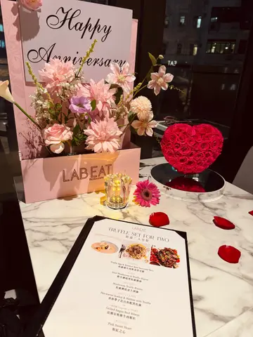 闺密生日我预早订了呢间餐厅同佢庆祝,一入到去就见到张枱布置得好靓,有专属花盒、玫瑰心心、铺满鲜花花瓣,浪漫气氛仪式感满满💯,甜品仲可以画碟,寿星女见到史迪仔开心到飞起!✨✨松露二人套餐✨✨💫前菜- 松露烧牛肉紫菜塔可饼|脆卜卜的紫菜包住粉嫩烧牛肉、蛋沙律,一咬落去就闻到好香嘅松露香气,作为开场前菜很适合。💫汤品- 野生蘑菇黑松露浓汤|一上枱已经闻到好香,喝得到磨菇颗粒好足料,每口都好浓郁黑松露味。💫主食- 松露蘑菇意大利饭|面头有几片现刨的松露片,有唔少菇菌粒,意大利饭口感适中,食落好creamy好香。💫主菜:◼️炭烧安格斯牛肉眼扒🥩要咗五成熟,切开仲好粉嫩,肉汁锁得好好,食落有少少炭烧香味。◼️香煎带子比目鱼配黑松露🐟带子煎到刚刚熟,保持到内嫩好厚肉鲜甜,比目鱼鱼皮煎到金黄色,鱼肉细嫩,底下嘅薯蓉亦好滑。💫甜品- 开心果柠檬蛋糕🍰|甜品配上画碟,呢个蛋糕唔止心型靓,仲要好好食,为今餐画上完美句点。🔹Baby Sangria 🔹Apple Tree两杯饮品🍸都好靓,满满水果香气,酸酸甜甜。**喺OpenRice 订座可享主菜餐牌正价88折(套餐、海胆多士、生蚝、黑松露黄油鸡、斧头扒及支装红白酒不适用)**…Read More