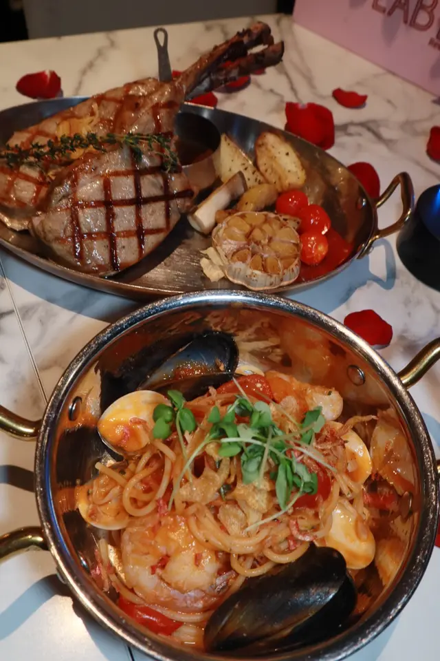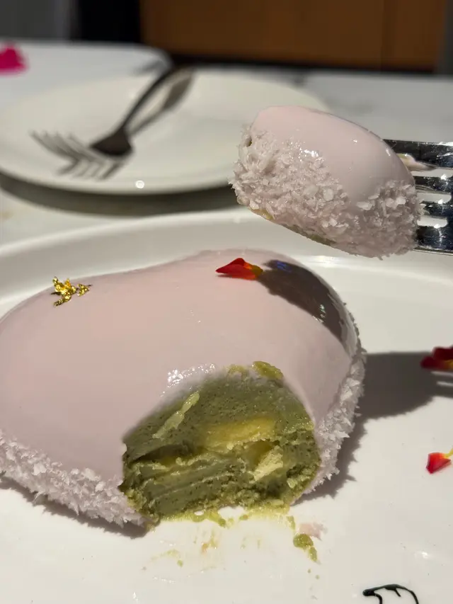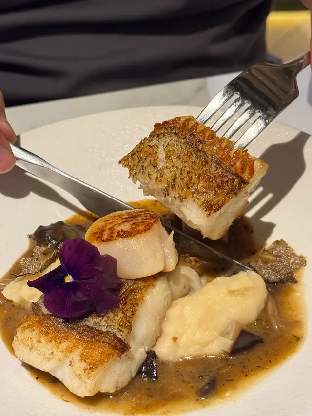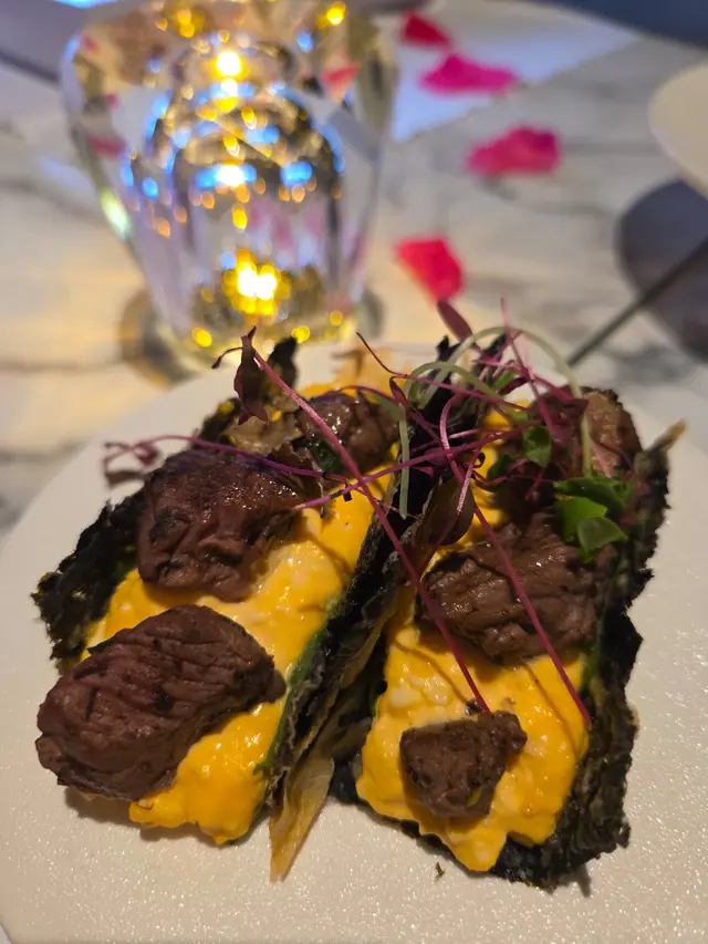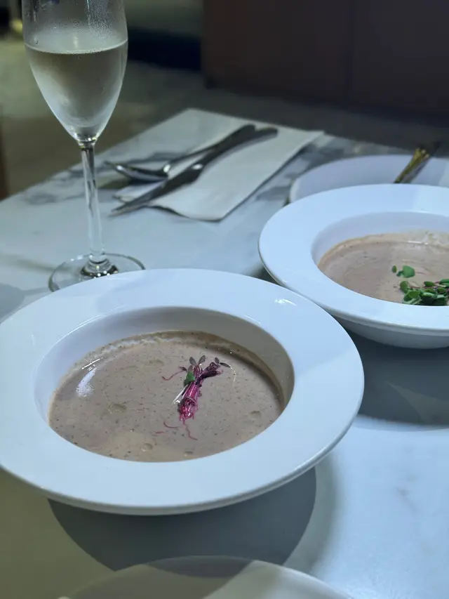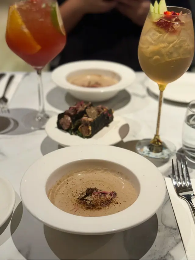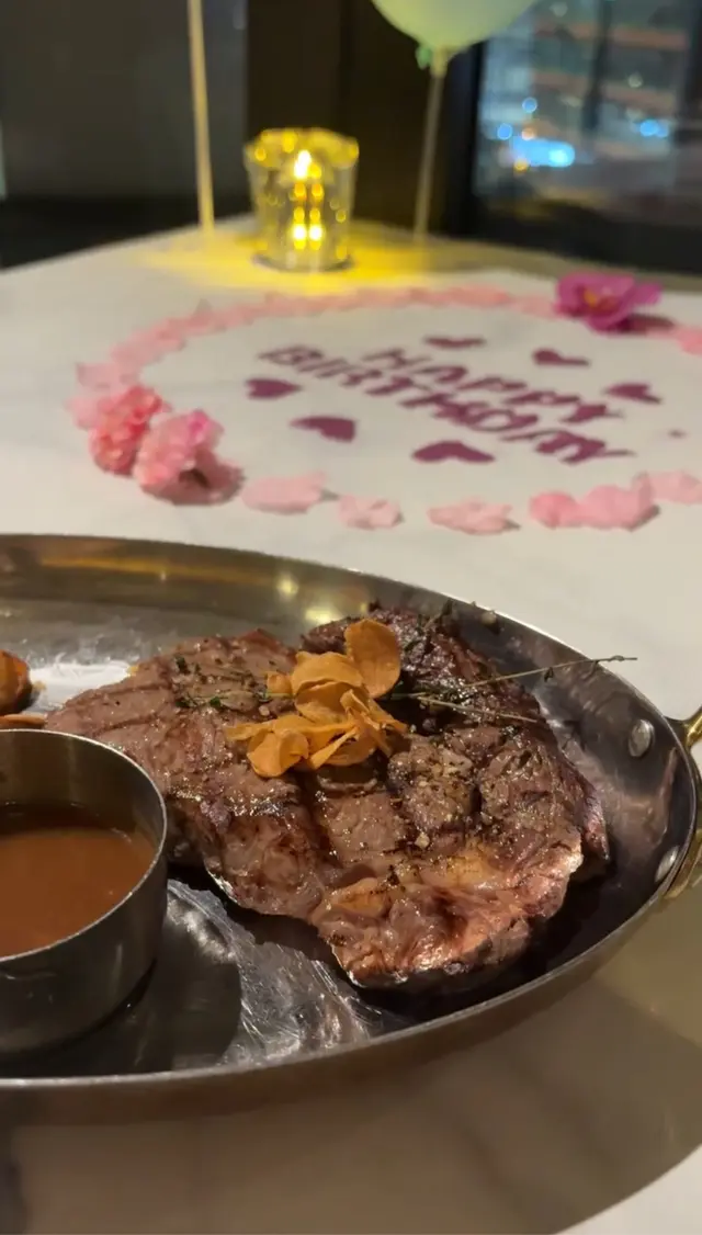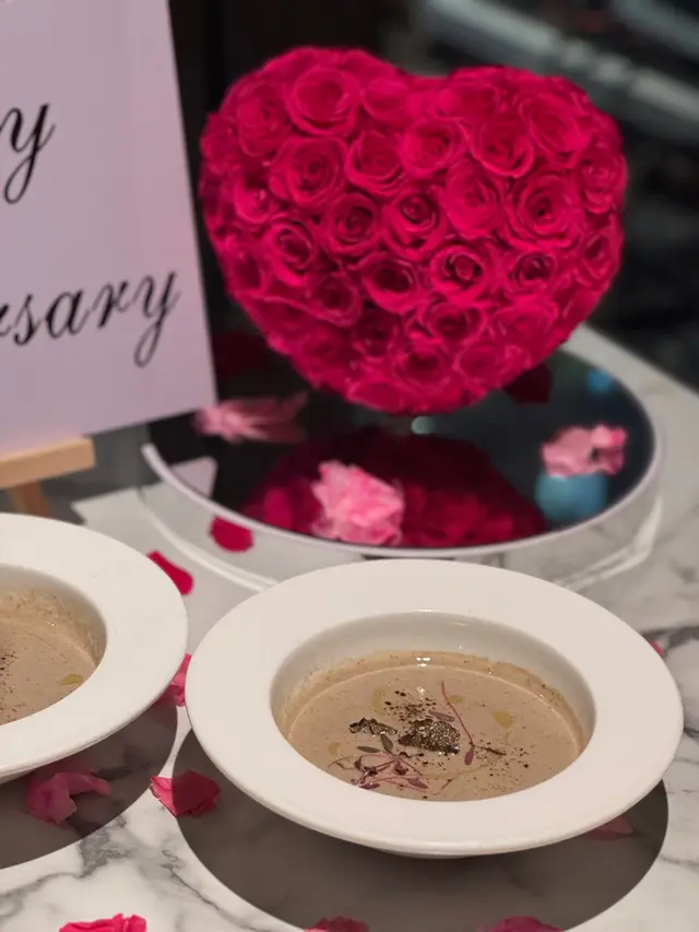 閨密生日我預早訂了呢間餐廳同佢慶祝,一入到去就見到張枱佈置得好靚,有專屬花盒、玫瑰心心、鋪滿鮮花花瓣,浪漫氣氛儀式感滿滿💯,甜品仲可以畫碟,壽星女見到史迪仔開心到飛起!✨✨松露二人套餐✨✨💫前菜- 松露燒牛肉紫菜塔可餅|脆卜卜的紫菜包住粉嫩燒牛肉、蛋沙律,一咬落去就聞到好香嘅松露香氣,作為開場前菜很適合。💫湯品- 野生蘑菇黑松露濃湯|一上枱已經聞到好香,喝得到磨菇顆粒好足料,每口都好濃郁黑松露味。💫主食- 松露蘑菇意大利飯|面頭有幾片現刨的松露片,有唔少菇菌粒,意大利飯口感適中,食落好creamy好香。💫主菜:◼️炭燒安格斯牛肉眼扒🥩要咗五成熟,切開仲好粉嫩,肉汁鎖得好好,食落有少少炭燒香味。◼️香煎帶子比目魚配黑松露🐟帶子煎到剛剛熟,保持到內嫩好厚肉鮮甜,比目魚魚皮煎到金黃色,魚肉細嫩,底下嘅薯蓉亦好滑。💫甜品- 開心果檸檬蛋糕🍰|甜品配上畫碟,呢個蛋糕唔止心型靚,仲要好好食,為今餐畫上完美句點。🔹Baby Sangria 🔹Apple Tree兩杯飲品🍸都好靚,滿滿水果香氣,酸酸甜甜。**喺OpenRice 訂座可享主菜餐牌正價88折(套餐、海膽多士、生蠔、黑松露黃油雞、斧頭扒及支裝紅白酒不適用)**…查看更多
