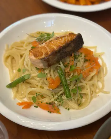 观塘海旁甲级写字楼的西餐,有户外座位,环境开扬舒适,非常适合慢慢坐Chill下。菜式提供西式及中西Fusion,配搭非常有创意!!- 台北剁椒牛柳意粉 HK$128中西合壁味道!!牛柳煎得焦香同时有黑椒香气,口感较硬熟度过火。台北剁椒汁中有猪肉碎及中式墙汁调味,微辣中带少少麻香,亦都有啖啖酸辣香勾起肉香。中式同西式结合夹得黎又唔会太怪,只不过牛柳太熟,可惜。- 开心果拿铁 HK$19开心果香十足可以一试!!除左可选全脂奶外亦可转做燕麦奶,开心果香气浓郁,同时有燕麦奶麦香,开心果碎添加唔少口感,拿铁香滑中带点果仁口感,几好饮!!- 三文鱼芦笋奶油意粉 HK$128- 鲜姜梳打 HK$19- 全日早餐 HK$128…查看更多
