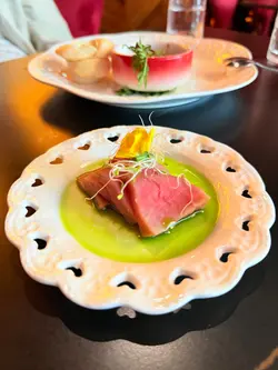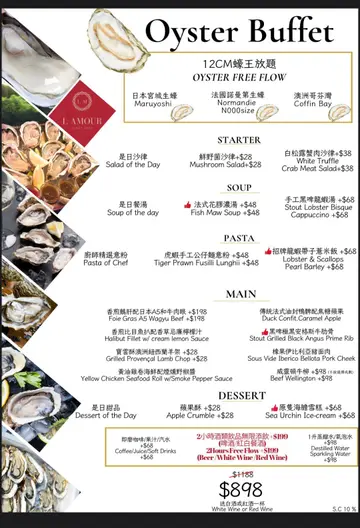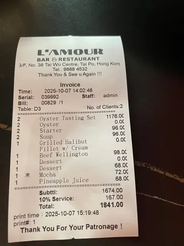 餐厅好近太和街,位置唔多但都坐得舒服。我地weekend 中午黎食系差唔多满座,所以最好book定枱。话明系Oyster Tasting Menu,当然有靓靓生蚝食。日本,法国同澳洲生蚝各两只。大大只生蚝见到已经胃口大开。日本生蚝比较有浓郁的海洋风味,食个鲜味。法国生蚝就层次比较丰富,肉质柔滑,我最钟意!澳洲蚝肉身肥美而口感鲜甜,比较有余韵。各款都各有特色,唔太食生冷野嘅妈咪都食晒三只!法国餐嘅餐汤都值得期待,今次我地试左龙虾汤同「是日手工浓汤」 。龙虾汤好浓郁,不过最惊喜系今日嘅鱼汤,超鲜甜,仲有啖啖鱼肉。我地冇另外加钱升级Starter,拣左「是日沙律」,事实证明都系冇拣错,全部都系新鲜食材配搭嘅厨师推介。主菜分别食左「法式日本A5和牛肉眼」 同 「北海道有机南瓜带子薏米饭」。所谓法式和牛系指将法式料理的烹调技巧运用于日本和牛上,呢种食法都系第一次,一样能展现和牛独特的油花与肉质风味。和牛再配上三色南瓜泥,薯仔泥同蕃薯泥,等于一牛三食,非常有新意。最后仲有一人一大块靓靓又好味嘅芝士蛋糕,妈咪食唔晒,我一个人食晒1.5块就知我有几咁钟意…查看更多