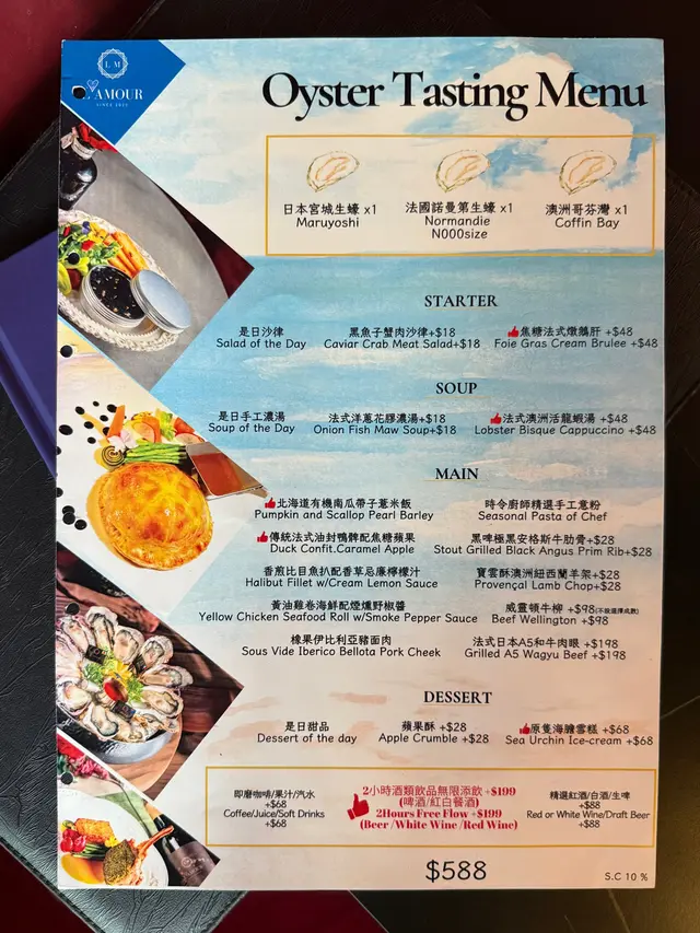 餐廳好近太和街,位置唔多但都坐得舒服。我地weekend 中午黎食係差唔多滿座,所以最好book定枱。話明係Oyster Tasting Menu,當然有靚靚生蠔食。日本,法國同澳洲生蠔各兩只。大大只生蠔見到已經胃口大開。日本生蠔比較有濃郁的海洋風味,食個鮮味。法國生蠔就層次比較豐富,肉質柔滑,我最鍾意!澳洲蠔肉身肥美而口感鮮甜,比較有餘韻。各款都各有特色,唔太食生冷野嘅媽咪都食晒三只!法國餐嘅餐湯都值得期待,今次我地試左龍蝦湯同「是日手工濃湯」 。龍蝦湯好濃郁,不過最驚喜係今日嘅魚湯,超鮮甜,仲有啖啖魚肉。我地冇另外加錢升級Starter,揀左「是日沙律」,事實證明都係冇揀錯,全部都係新鮮食材配搭嘅廚師推介。主菜分別食左「法式日本A5和牛肉眼」 同 「北海道有機南瓜帶子薏米飯」。所謂法式和牛係指將法式料理的烹調技巧運用於日本和牛上,呢種食法都係第一次,一樣能展現和牛獨特的油花與肉質風味。和牛再配上三色南瓜泥,薯仔泥同蕃薯泥,等於一牛三食,非常有新意。最後仲有一人一大塊靚靚又好味嘅芝士蛋糕,媽咪食唔晒,我一個人食晒1.5塊就知我有幾咁鐘意…查看更多