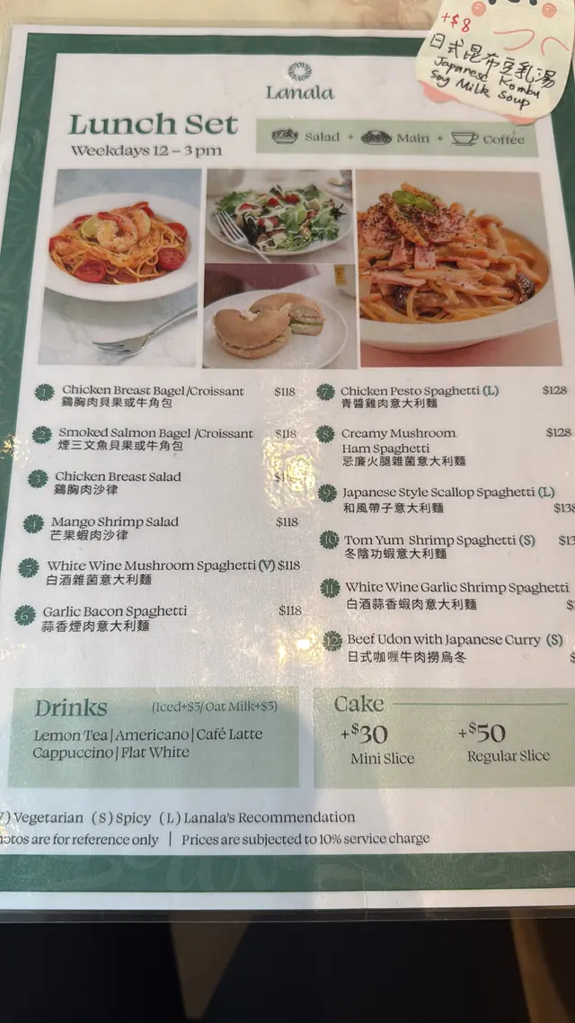 位於中環威靈頓街的 Lanala,主打精緻西式簡餐。五人午餐嘗試五款主菜:香草雞意面($128)醬汁濃郁,但味道略嫌偏淡;雞胸貝果($118)扎實健康,包有翻熱,配上cream cheese味道不錯,有驚喜;白酒蘑菇意面($123)素食友好,蒜香培根意面($118)咸香惹味,即叫即整;招牌「Lanala Bowl」($148)食材豐富,配上藜麥飯夠健康,可自選搭配醬汁或走醬汁。每份主餐均配清爽沙拉,熱飲表現亮眼——燕麥奶cappuccino (+$5)香醇順滑,港式檸檬茶中規中矩。 優點:食材搭配用心,咖啡專業度高(提供latte/ cappuccino/ flat white等),定制選項靈活(如更換植物奶、去醬汁)。人均約$140屬中環合理價位,環境舒服悠閒,整體適合商務簡餐或健康飲食愛好者,上菜效率高,店員Joanne服務細緻。 總結:穩定不出錯的都市輕食選擇,勝在位置便利與配餐均衡,推薦給追求快捷品質的白領一族。查看更多