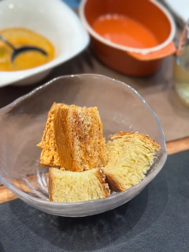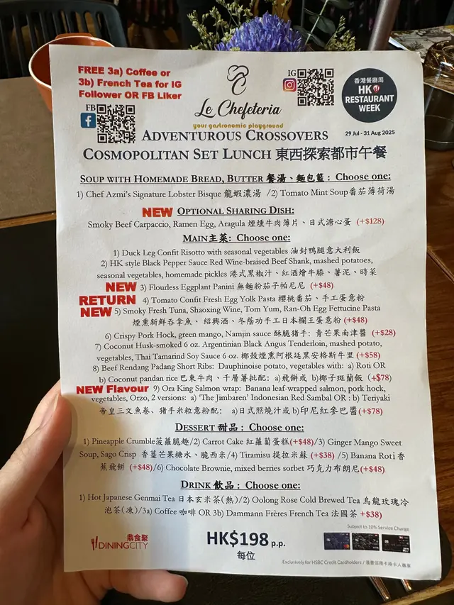 星期日臨時臨急想食西餐,restaurant week 見呢間仲有得book ,咁就即book 啦,book 咗2點,早咗10分鐘到,要喺餐廳門外即係樓梯走廊位等待。見入邊啲客人離開咗兩枱,我哋都仲未有得入去,入座前等候的體驗不太好,喺樓梯附近企的感覺唔太好。入到餐廳度都未安排好我們的位置就急急點餐落單先,okay ,因為都接近2點,餐廳都想快啲幫我哋準備到食物。嚟之前已經睇咗openrice 食評,去返峇里風x 西餐的fusion ,都想試試有什麼特別。- Chef Azmi's Signature Lobster Bisque 龍蝦濃湯-龍蝦湯加入咗冬陰功。平時飲龍蝦湯會飲到中段覺得悶悶地,呢款加入咗冬陰功嘅,有少少香料的香味,同埋有啲微微辛辣,飲落又冇咁悶,幾好。我哋原先的麵包籃,俾咗遲過我哋嚟的客人,碗湯飲咗一大半先有得食啲麵包。食物一下子嚟得好急,未飲完個餐湯,主菜就已經到。 -Smoky Fresh Tuna, Shaoxing Wine, Tom Yum, Ran-Oh Egg Fettucine Pasta煙熏新鮮吞拿魚、紹興酒、冬蔭功手工日本欄王蛋意粉(+$48)-吞拿魚係有煙熏味嘅,係全熟,咬落去軟腍腍,冇想像中有一絲絲肉質感嘅感覺,同埋吞拿魚嘅份量就比較少嘅。係個紹興酒+冬陰功配搭嘅扁意粉就幾得意囉。-Coconut Husk-smoked 6 oz. Argentinian Black Angus Tenderloin, mashed potato,vegetables, Thai Tamarind Soy Sauce 6 oz. 椰殼煙熏阿根廷黑安格斯牛里(+$58)-牛里肉都係普普通通啦,薯蓉加入咗啲泰式嘅微辣香料,冇咁滯,又幾得意嘅。主菜的小結論是,肉的質素普通/麻麻哋,淨係靠廚師的一雙巧手,透過煮食技巧、食材的配搭、醬汁來提升食物品質。-Tiramisu 提拉米蘇 (+$38)-據說是用了日本欄王蛋整的Tiramisu,會見到cream的位置較橙黃。Tiramisu應有的rum酒香、cream的幼滑度全部都做得好好,正常發揮!-Banana Roti 香蕉飛餅 (+$48)-有一球雪糕的香蕉飛餅,飛餅煙煙韌韌的,夾咗香蕉喺入面。呢款甜品有好多唔同嘅層次,幾好食嘅。食完接近3點半,才知道因上場的客人遲到(35-45分鐘!)令所有上菜用膳時間都延後了,繼而令我們等候入餐廳的餐飲體驗不好。如果你問我Restaurant Week係咪平咗好多?又唔係喎!主菜除咗兩款之外,其他都要加錢,甜品得一款唔使加錢,其他好多款都要加錢。加下加下,張單就4百幾數2個人變6百幾蚊2個人😂我都明餐廳要俾平台費俾Restaurant Week平台,會俾一般餐牌賺少咗。可能就當賣個廣告費,博多啲人認識自己嘅餐廳,多啲客人,又多啲回頭客啦。…查看更多