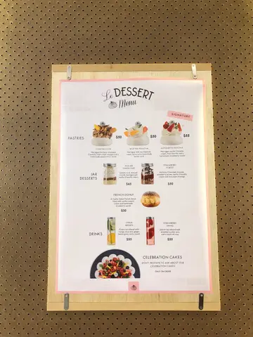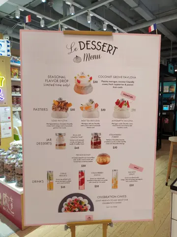 Weekends are fairly quiet in one area of the city. As I was wandering around by myself, I wanted a place to sit and rest my tired feet. That was when I found Le Dessert.It was a kiosk inside Lab Concepts serving pavlovas! It's a take away type of place but there are seats on the side.Menu is in English only. There is no 10% service charge. Along with pavlovas, they also sell other desserts.I ordered an Antoinette Pavlova ($55). Named after the former Queen of France, I guess as the other one they had was called Louis. This was a meringue topped with chantilly cream, strawberries and raspberries and dots of raspberry coulis. I think I'm used to the pavlovas in Canada where they are the size of your face and expected to share with a crowd. And SUPER sweet So, this small size was just perfect. It alsos wasn't sweet at all. Also, the ones I've had in Hong Kong were always so disappointing. Always chewy or hard as a rock. This wasn't. It broke apart easily with my thin wooden spoon. It literally tasted like clouds. The cream was wonderful. Rich and yet not overly sweet. Topped with fresh berries and the lovely coulis, this was perfect little dessert.A great little place for dessert break. Worth the price.…查看更多