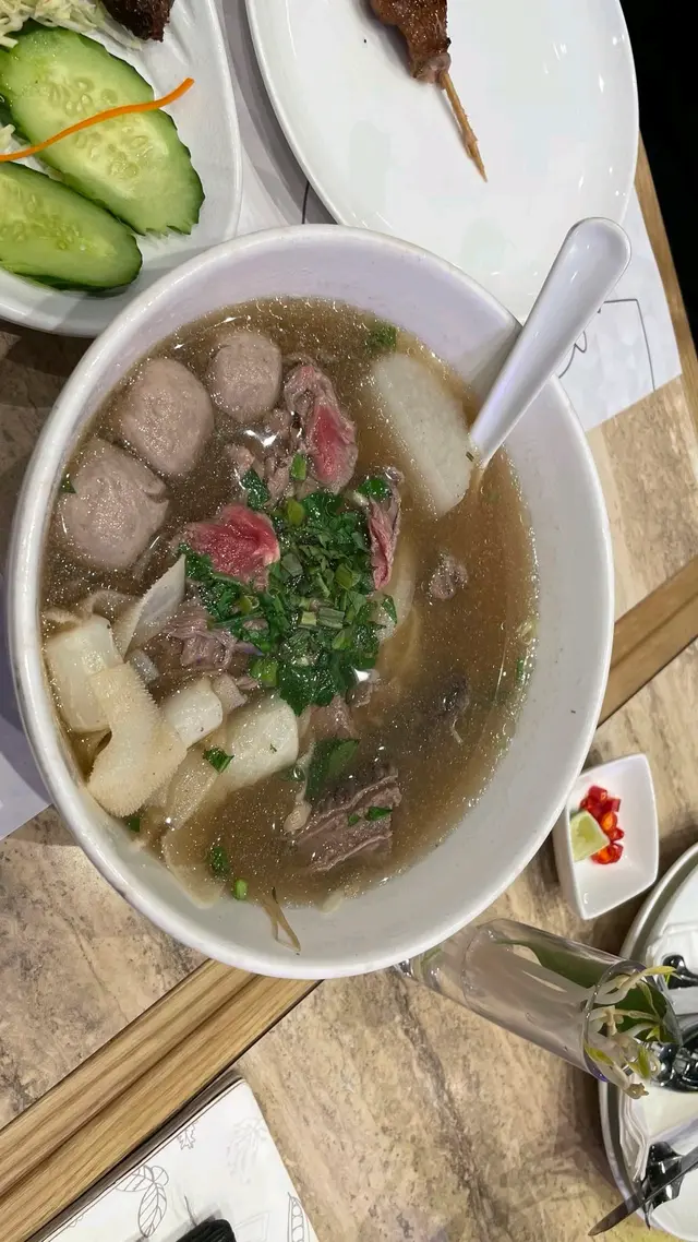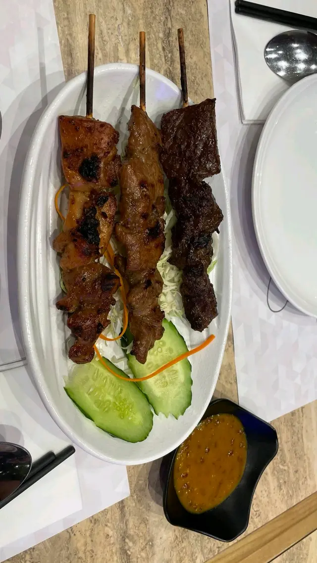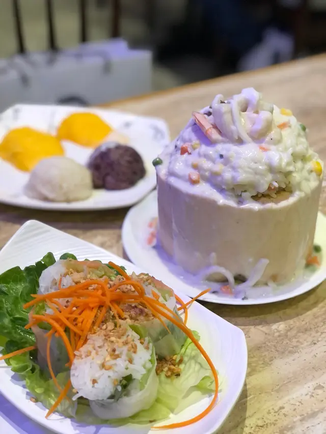 ,成個湯酸酸甜甜,好醒胃,我哋食到一滴不留。青木瓜大蝦雞絲沙律賣相幾靚❤️,大蝦新鮮彈牙。串燒雞牛豬烤得唔乾幾惹味。春卷脆卜卜熱辣辣好味喎😋!自己就對海鮮炒檬粉冇乜特別興趣,海鮮材料都豐富不過就比較淡味。最後梗係唔少得甜品啦,呢個拼盤有越南綠豆拉高椰糕、芒果糯米飯、焦糖燉蛋,芒果都幾大件多汁幾甜,配暖暖嘅糯米飯,真係好懷念泰國呀🥺,椰糕都係暖暖嘅,非常QQ,椰香味唔算重亦唔會太甜,比較失色嘅燉蛋感覺煮過龍,唔夠滑。整體食物質素都唔錯,三個人叫咗好多唔同種類嘅嘢,大滿足嘅一餐