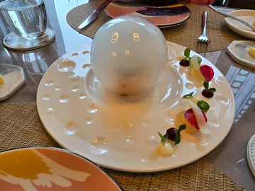 呢间餐厅由法国蓝带厨师主理,主打精美法式Fine Dining🇫🇷🍷4 Course Lunch Menu ($318/ ppl)💗Welcome Food开胃小菜以醋汁西瓜配车厘茄打开序幕,味道酸爽开胃🍉💗Bread Basket面包篮分别有法式长棍面包、牛角包、酸种面包同布里欧面包🥖全部新鲜烘热,外脆内软,搽上牛油食绝配🧈💗King Fish Carpaccio油甘鱼刺身厚切爽滑,加上三文鱼籽鲜上加鲜,伴以香橙同西柚肉,令整体味道更清新🍊💗Quail Leg Salad杂菜沙律加上车厘茄、粟米同松子仁,以醋汁调味,味道清新开胃🥗面头放上两只香煎鹌鹑髀🍗💗Matsuba Crab Royale (+$88)蟹肉蒸蛋食落去每一啖都系满满鲜甜嘅松叶蟹肉,基本上完全食唔到蛋🤣再以茴香泡沫同蟹籽点缀🦀💗42°C Fresh Smoked Salmon (+$118)42°C慢煮三文鱼粉嫩柔软,入口即化,最特别系带有苹果木烟熏香味🪵表面放上大量12年保加利亚鱼子酱,令味道更咸鲜🖤可配上旁边嘅乳酪酱、红菜头果蓉同苹果辣根啫喱变奏出不同风味💗Chef Selected Daily Soup椰菜花忌廉浓汤Creamy滑顺,以煎香嘅椰菜粒同面包糠点缀🥦💗Fish of the day甘鲷立鳞烧先用高温油炸鱼皮,令鱼鳞酥脆立起,再慢火煎香鱼肉,令鱼肉保持嫩滑🐟伴以龙虾汁,令整体海鲜嘅鲜味更浓🦞伴菜方面有清甜嘅白甘荀蓉同烤蔬菜🥕💗Roast M5 Wagyu Denver Beef澳洲M5丹佛牛排属于牛肩胛部位,肉质软嫩同时带有嚼劲嘅肉筋,肉味浓郁而且有适量油脂分布🐂厨师完美掌握五成熟,更令牛排充满炭烧香,伴以牛肉汁,令风味更浓🥩伴菜方面有幼滑嘅松露薯蓉同烤蔬菜🥔💗Chef Selected Daily Dessert焦糖炖蛋香滑细腻,烧上一层香脆焦糖面🍮伴以杂莓同云呢拿雪糕,享受冷热嘅口感冲击🍨青提芝士冻饼非常特别,最底层系消化饼底,中层系幼滑嘅芝士慕丝饼🍰最顶层系以新鲜香甜嘅青提做成啫喱🍇伴以杂莓同云呢拿雪糕💗Tea or Coffee…查看更多