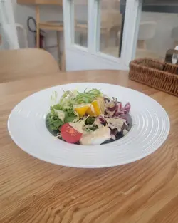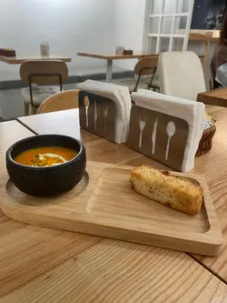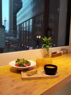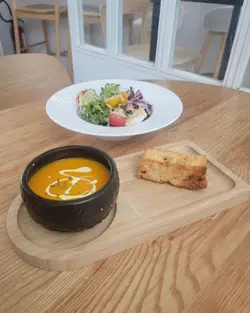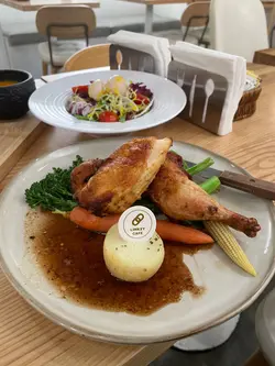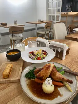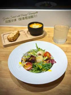 周末喺上环俾我揾到一间「隐世」咖啡室,位置虽然喺中上环咁繁忙嘅地段,但一踏入去,气氛却出奇地宁静。透过大玻璃窗,可以望到窗外经典嘅叮叮电车慢慢驶过,一边用餐一边欣赏香港城市节奏中嘅小确幸,真系几治愈。🥗Garden Salad with Orange Vinaigrette 田园沙律(配香橙油醋汁)清新醒胃,喜欢这材料配搭,尤其加上荔枝,果香甜味突显,提升层次亦令口感更丰富。香橙油醋汁味道出色。🥕Carrot Soup甘笋汤甘笋汤整得好有水准。汤底好香滑浓郁、充满焗烤甘笋嘅天然甜香同层次感,甜而不腻,质感顺滑。饮落感觉好味又健康。🐓French Roasted Spring Chicken with Roasted Potato 法式烧春鸡配烤香草牛油薯仔主菜法式烧春鸡 外皮金黄焦脆。切开嘅一刻,肉汁即刻渗出,鸡肉入味又嫩滑。烤香草牛油薯仔外皮微脆,薯仔香甜绵密。特别欣赏个gravy,味道丰富浓厚,带出鸡肉嘅甘甜同深层香气。…查看更多