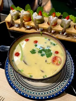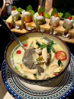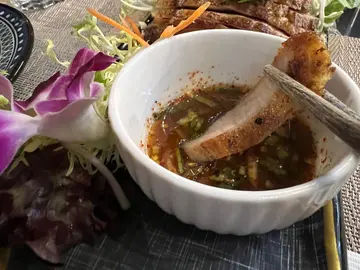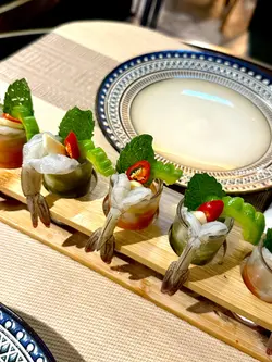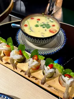 估唔到有咁大个场同时比人食泰国菜,又可以掟飞镖同唱k,好有气氛呀!空间好大,另一边同埋包房都有公司包咗部分地方员工聚餐!好热闹!泰式生虾6只 $138杯仔生虾好有仪式感!生虾新鲜弹牙,配上酸辣惹味嘅泰式酱汁,简直是人间美味!🤤 虾肉鲜甜,酱汁带有蒜蓉、辣椒🌶️和柠檬🍋嘅香气,令人胃口大开!💯泰式炸虾饼 $108外脆内嫩嘅虾饼,每一口都充满虾肉嘅鲜味!虾肉弹牙有咬口🍤 沾上甜甜嘅梅子酱,滋味无穷!😋 虾肉份量多必需同朋友分享!泰式冬荫功汤 $138浓郁嘅冬荫功汤,酸酸辣辣,非常开胃!🌶️ 汤底充满香茅、南姜同埋柠檬叶嘅香气,加上鲜虾🦐、菇菌🍄同埋番茄🍅,味道丰富有层次!辣得好过瘾👍马拉盏炒通菜 $88镬气十足嘅马拉盏炒通菜,咸香惹味!🥬 通菜爽脆,马拉盏香味扑鼻,令人食欲大增!🤤泰式椰汁冰 $48食住辣辣嘅泰国菜,整返杯冰凉嘅椰汁冰解辣!🥥 椰汁味香浓,甜度适中,非常解渴!🌴…查看更多
