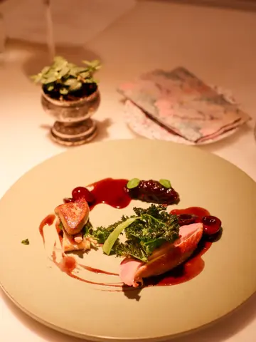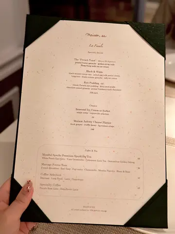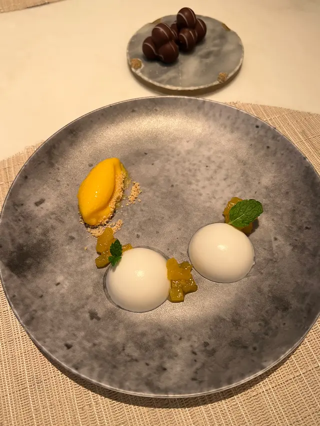 湾仔区以复古花园风design嘅Maison ES Signature Elite 4 course (HK dining week)晚市套餐($580/位).⸝꒰ 1 ˢᵀ course ꒱ 烤熟成墨鱼三文鱼子。萝卜。青瓜。水菜。香辣芝麻酱制作熟成墨鱼香软又充满弹性 配上三文鱼子更鲜味底下芝麻酱再配搭镇江香醋&生椒油令味道充满层次꒰ 2 ᴺᴰ course ꒱ 番茄他他将新鲜蕃茄制成他他 配上枝豆及山楂啫喱味道相对清爽开胃 可以清新一下口腔去迎接主菜꒰ Main ꒱香烤鸽肉•备长炭烤油甘鱼鸽肉以盐水处理后再烤香 切开鸽肉粉嫩又充满肉汁 带住微微香甜感 配上香茅南姜法罗麦 烟烟韧韧带点坚果香油甘鱼充满丰腴鱼油甘香及淡淡炭香 配搭柠檬白酒牛油汁更突显鲜味 旁边仲配上鱼子酱&芦笋꒰ Side ꒱ 大蒜法式薯条•豆豉炒意大利黄瓜蛋黄酱加入炸蒜粒 更香更惹味用上中式豆豉配搭意大利黄瓜估唔到又几夹꒰ Dessert ꒱芒果芝士蛋糕慕丝整道甜品好轻盈 芒果蓉充满果肉又甜最后亦送上充满柠檬香嘅马卡龙…查看更多