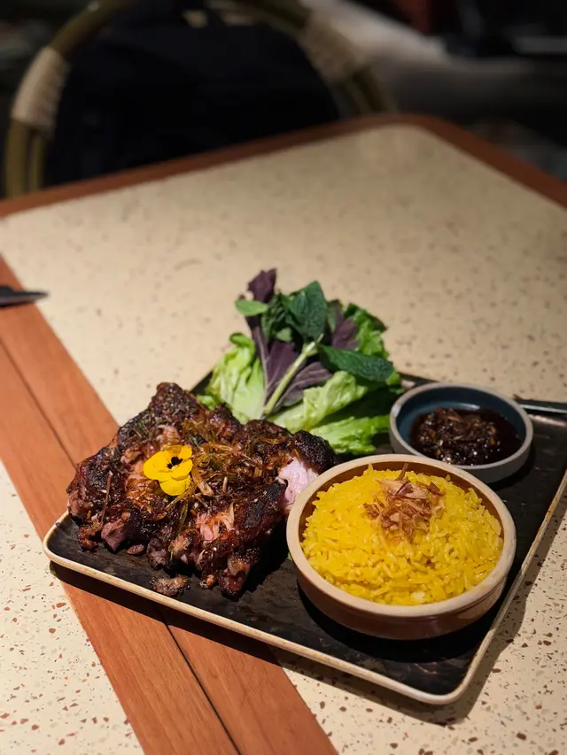 慢煮豬肋條 豬肋骨係淡淡嘅醬油味同香茅味,味道幾有新意。唔會係嗰啲好多燒汁好重口味嘅傳統味道。雖然味道唔算好重,但係幾香,係好味嘅。份量又夠。 另外附上一碟黃薑飯,比較食到黃薑嘅香味。