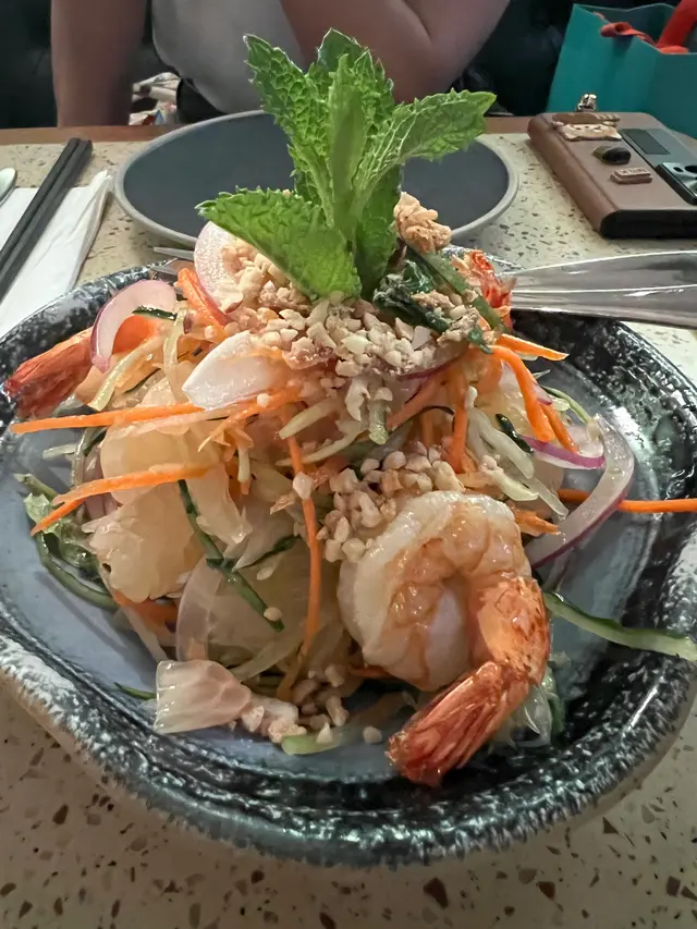 餐廳環境裝修得幾雅致舒適,不過枱同枱之間嘅距離有啲近。🤔炭燒蝦柚子沙律柚子切得比較大嚿, mix 咗酸酸地嘅蘿蔔絲,口感頗有層次。個汁偏酸,柚子唔算非常甜。至於隻蝦都爽彈,但係無論個樣同味道都唔係炭燒,有d 名不符實。