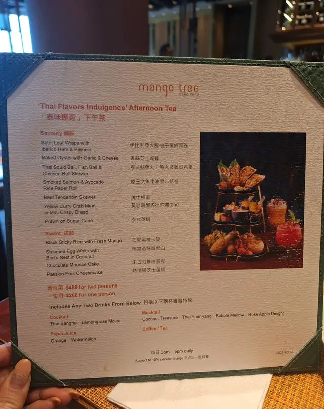 Element 嘅 Mango Tree推出超值「泰式悠間」下午茶套餐,每位淨係468兩位,e-shop仲有得減80!! 🫖 由鹹點到甜點,呈現泰國經典美食,有焗蠔,炸泰式蔗蝦,咖哩蟹肉包等賣相同味道都very nice ,CP值有夠高。呢個size既下午茶份量真係啱啱好 🥰 仲可以配特色飲品,例如佢地既泰色mocktail : Thai Yuanyang , Rose Apple Delight,黎一個泰國海岸邊清爽下午茶既感覺❣️每日3pm-5pm都有供應。再一邊望住M+同維港Savoury 鹹點伊比利亞火腿柚子檳榔葉卷香蒜芝士焗蠔泰式魷魚丸、魚丸及雞肉卷串煙三文魚牛油果米紙卷燒牛柳串黃咖喱蟹肉迷你農夫包泰式蔗蝦Sweet 甜點芒果黑糯米飯椰皇燕窩燉蛋白朱古力慕絲蛋糕熱情果芝士蛋糕兩杯自選特飲Thai Yuanyang Rose Apple Delight…查看更多
