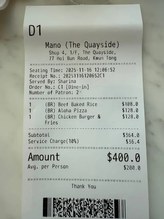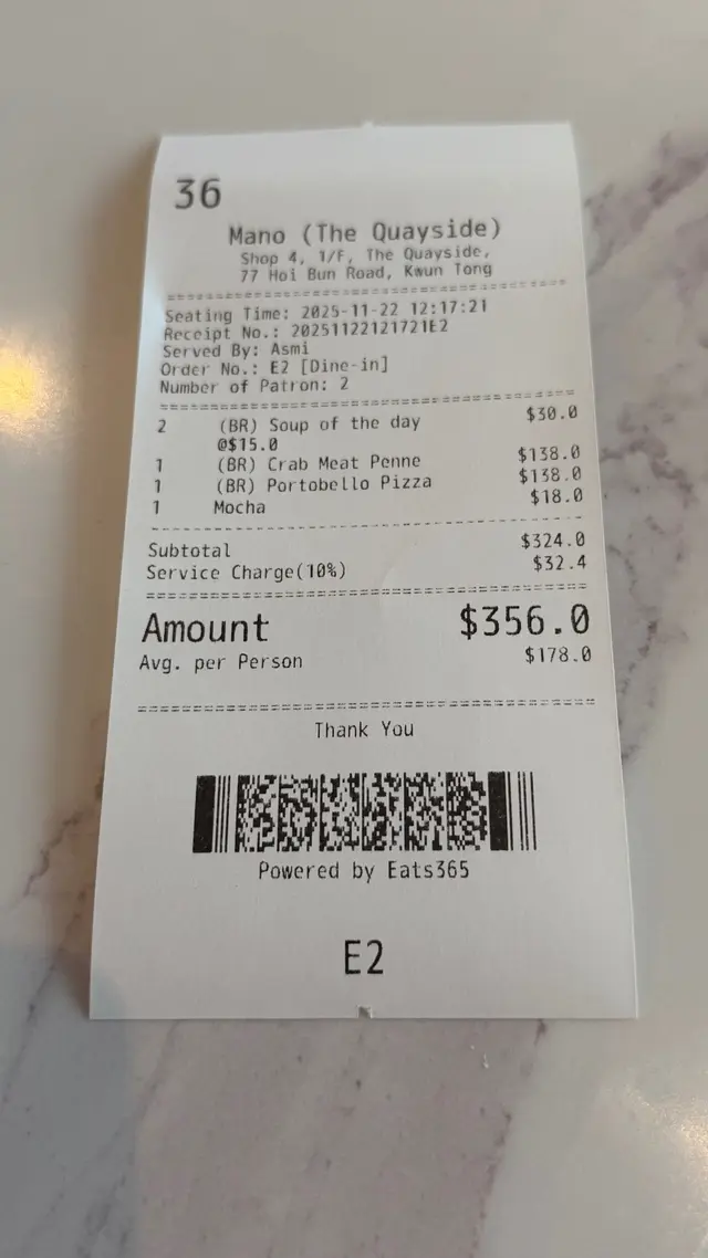 Mano (海濱匯) (观塘) 网上订位享低至75折优惠并赚Rice Dollars 网址: https://s.openrice.com/QrLS0PY0B00 地址: 香港觀塘海濱道77號海濱匯1樓4號舖 电话: +852 28976168