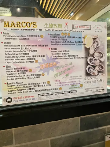 由曾于多间酒店任职的大厨Marco及Ben两兄弟创办。以传统意大利菜及扒类为主打,亦有生蚝、海鲜等菜式供应,消费平易近人。