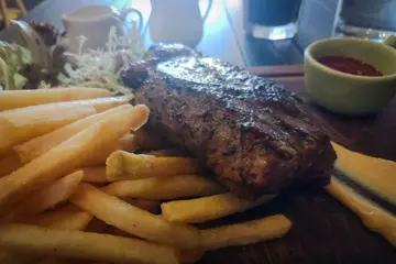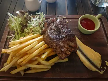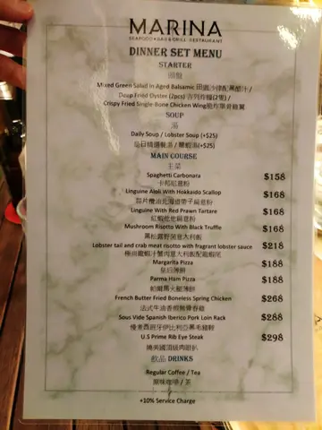 久唔久去土瓜湾食嘢,但系去亲都系北帝街𠮶头,今次走上天光道呢间小店竟然十分有惊喜,系返单之选。今晚第一次帮衬喺set dinner Menu入边点咗三个餐老婆同阿女都系点「龙虾汁蟹肉意大利饭配龙虾尾」,我叫咗个「烧美国肉眼扒」。 个餐前菜我哋都拣左炸吉列蚝,汤系洋葱汤。个吉列蚝炸得啱啱好又唔会油淋淋,洋葱汤佢反传统唔系清汤𠮶只,但我唔介意因为味道够浓就收货。个意大利饭一拎上枱就龙虾汁香味扑鼻,啖饭有咬口,龙虾味同蟹肉味互相比拼,件龙虾尾亦都啖啖肉,龙虾肉预其中嘅弹牙,虽然我略嫌佢咸咗少少,但系总结嚟讲成碟饭系好高分嘅,呢个餐两只吉列蚝一个汤一个饭再加一杯咖啡收$218我觉得系超值。另外𠮶餐主菜系肉眼扒,件扒虽然唔系厚切,但系有碳香味呢个系小弟最钟意嘅,我叫五成熟佢亦都控制得好好,份量唔细又有肉味又够腍又juicy. 另外要赞佢嘅就系嘅配菜亦都唔系求求其其放两件翠玉瓜俾你,又有蕃茄又有南瓜又有芦笋,摆盘亦都唔错,成个餐$298。 本来小弟一直觉得喺外边食件扒如果低过$300都唔慌好食,但系今次真系有惊喜。临尾一杯即磨咖啡都唔错,都几苦但我都可以接受。唯一系佢嘅餐牌有啲格格不入,因为佢个餐牌做得好似茶餐厅咁甚至比茶餐厅更差,感觉都几搞笑。…查看更多