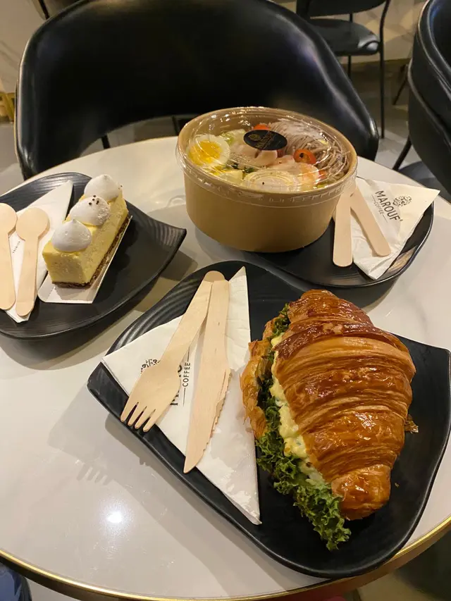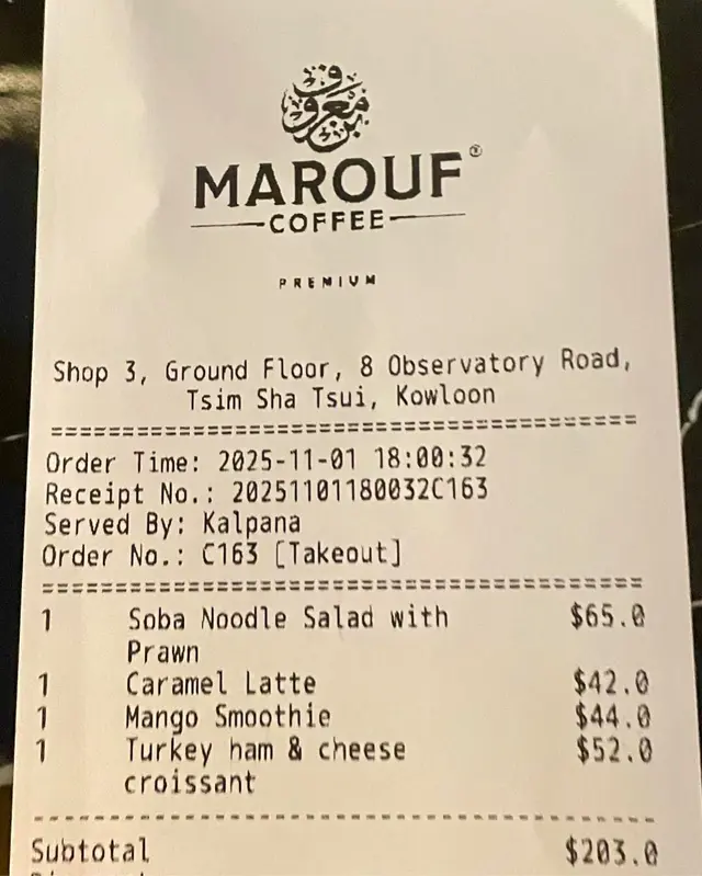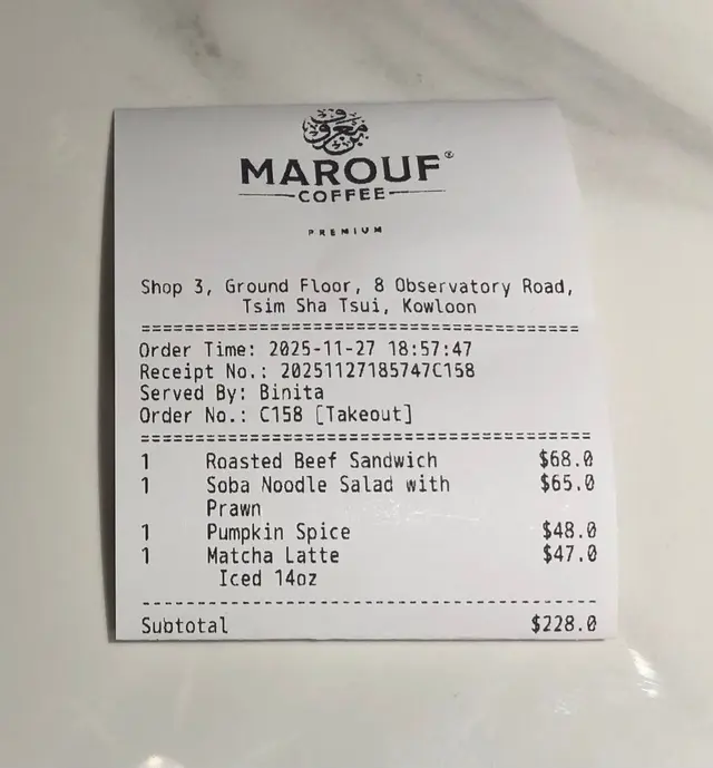 # ☕【Marouf Coffee 尖沙咀】中東風味注入嘅靜心角落 上星期同老婆夜晚行尖沙咀,無計劃咁行到天文台道,見到呢間 **Marouf Coffee**。門口設計乾淨簡約,金光字體加黑色裝修,有啲異國風,好吸引眼球。上網一查,原來佢哋主打阿拉伯咖啡,好特別,立即入去試吓。 ---## 🌿 環境 裡面坐位唔算多,不過枱距闊落,有啲地方係落地玻璃,可以見到街景。**光線柔和,氣氛舒服,有少少高級lounge感覺。** 啱晒晚餐後chill下,又或者情侶想靜靜傾偈。 裝修簡潔但有品味,用色以黑金、木質為主,**比起一般咖啡店感覺更精緻啲。** ---## 🥐 蛋沙律牛角包 $44 牛角包一上枱已經聞到香味,外層**烘到金黃色、酥脆又帶少少牛油香**。 入面夾住份量十足嘅蛋沙律,滑滑 creamy,蛋味香濃,但唔會太膩。 中間仲有新鮮生菜,增加咗少少清爽感,**整體好平衡,好似簡單但認真嘅輕食。** 我老婆話呢個完全值得再食一次,尤其係啱啱焗完咁嘅香氣。 ---## 🍜 蕎麥麵沙律配蝦 $65 賣相好乾淨整齊,整體好似日本便利店沙律升級版。 有冷凍蕎麥麵、沙律菜、全蛋切片、蝦仁同蕃茄仔。 醬汁係少少芝麻味道,好襯蕎麥麵嘅淡香。 **蝦新鮮爽口,唔腥;麵唔黏笠,凍咗都保持彈性**。 呢個沙律食落清新,係啱晒夜晚唔想食太heavy 嘅朋友。 ---## 🍰 Sernik Cheese Cake $50 件芝士蛋糕啱啱睇就好靚,面層鋪咗三團白白嘅忌廉,外型幾特別。 食落質感**偏實身少少,唔太甜,芝士味濃但唔膩。** 底層餅皮好香脆,有牛油香,我老婆話佢最鐘意就係嗰層餅底,有咬口,唔似有啲太軟嘅芝士餅咁單調。 ---## ☕ 特飲:凍開心果鮮奶咖啡 + 熱南瓜味咖啡 ### 🧊 凍開心果鮮奶咖啡 $52 呢杯係我嘅心水之一!入口第一啖已經有啲**堅果香氣,開心果味濃郁得嚟唔苦**。咖啡味都幾重,但融得幾自然。 混合鮮奶後變得滑滑地,好似甜品同咖啡之間嘅中間點。 唔似其他café嗰啲過甜開心果latte,呢杯係**真材實料、飲得出層次感。**### ☕ 熱南瓜味咖啡(Pumpkin Spice)$48 老婆揀嘅節日限定特飲,上面一大團鮮忌廉,再灑上肉桂粉,一睇就好有秋冬氣氛。 啜一口,**咖啡香同南瓜味齊齊出,肉桂香好明顯但唔搶味。** 甜度控制得好,熱飲嘅溫度啱啱好,飲完整個人都暖晒~ ---## 💸 價錢 & 總結 兩個人一共 **$259**,以尖沙咀嚟講其實算合理。 食物用料新鮮、細節有誠意,最難得係**咖啡真係有自己風格**,唔係千篇一律嗰種。 環境舒服、唔嘈,**幾啱坐耐啲或者做吓野。** ---## 🌟 總結感想 > **Marouf Coffee** 絕對唔係一般連鎖咖啡店, > 阿拉伯風味嘅咖啡同輕食style令人印象深刻。 > 味道上有驚喜、環境又優質, > 如果你想避開人多多嘅咖啡館,靜靜坐下享受杯好咖啡,呢度真心推介。 📍 **地址**:尖沙咀天文台道8號地舖 ☕ **必試**:開心果鮮奶咖啡、蛋沙律牛角包 🍰 **甜品推介**:Sernik Cheesecake 💬 **整體評分**:9/10 – 有質有味的中東系café!…Read More