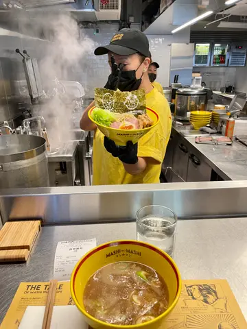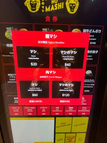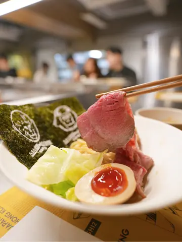 Mashi no Machi价钱: $185好味程度: 3.7/5服务🍴: /环境🗾: 3.4/5性价比🥢: 2/5回头率😚: 2.5/5)-bookmark左呢间和牛拉面超耐!今次终于食到,去左佢地位于铜锣湾后边唔系好方便嘅总店。同喺日本食拉面一样,都系喺门口部机度买咗飞先,跟住入去揾位坐低食。望住店员整完之后佢就会摆返个招牌甫士俾你影张相😂-✅中意的系佢地个面质偏粗,好有咬口😋会系面条中见到小麦粒,不过挂汤能力一般,都有小小碱水味🤐-汤汁首先出来的味道系鲣鱼味,加上d好似寿喜烧汁的甜味,咸中带甜,质感浓厚😆几好食。-配料有3片和牛、椰菜、笋、紫菜、半只🥚。🥚正常水准,有用酱油腌过,蛋黄唔系好流心。和牛唔系肥美,而系软嫩肉感的,都ok😚-总结系其实都OK,几钟意个面同酱汁,但系性价比太低,试一次就算了。…查看更多