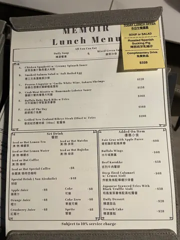和朋友去了铜锣湾一家楼上的西餐厅吃午餐。一到那里就看到墙上有个幻彩投影灯,立刻拍了张照。进入餐厅后,感觉环境非常好,昏暗的灯光配上浪漫的装修,气氛十分不错。我们叫咗两个lunch set❇️意式香草忌廉烟三文鱼意大利饭🍛这道菜非常重奶油味,味道十分浓郁,非常好吃😋😋❇️香煎盲𫚧鱼柳配鲜虾和蕃茄忌廉汁🍅🐟🦐虾非常爽口弹牙,鱼柳都煎得皮脆肉滑,虽然鱼的味道稍微清淡了一点,但清新口感也别有一番风味😗👍我们重加咗一份水牛城鸡翼。水牛城鸡翼不太辣,非常适合不吃辣的朋友,但我个人觉得如果再辣一点会更好🍗总结响铜锣湾呢个地段,加上舒服既环境和食物质素,性价比不错!下次可以试试晚餐!…查看更多