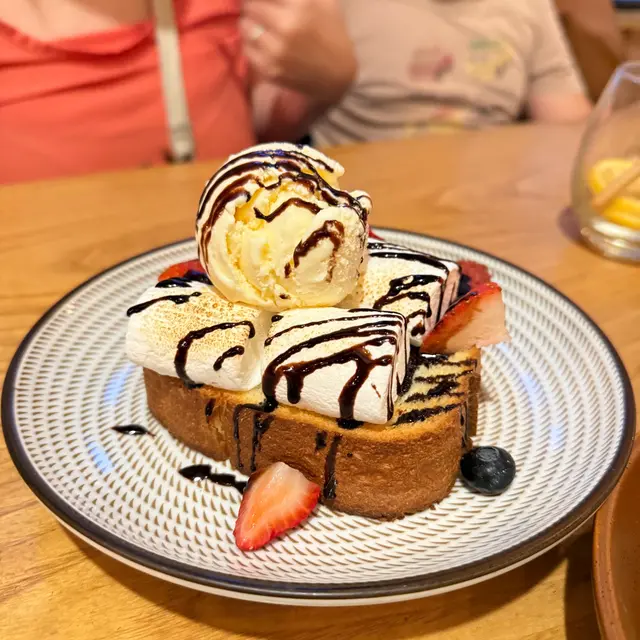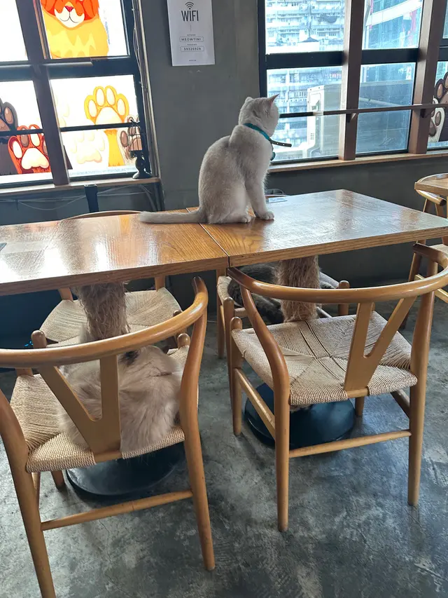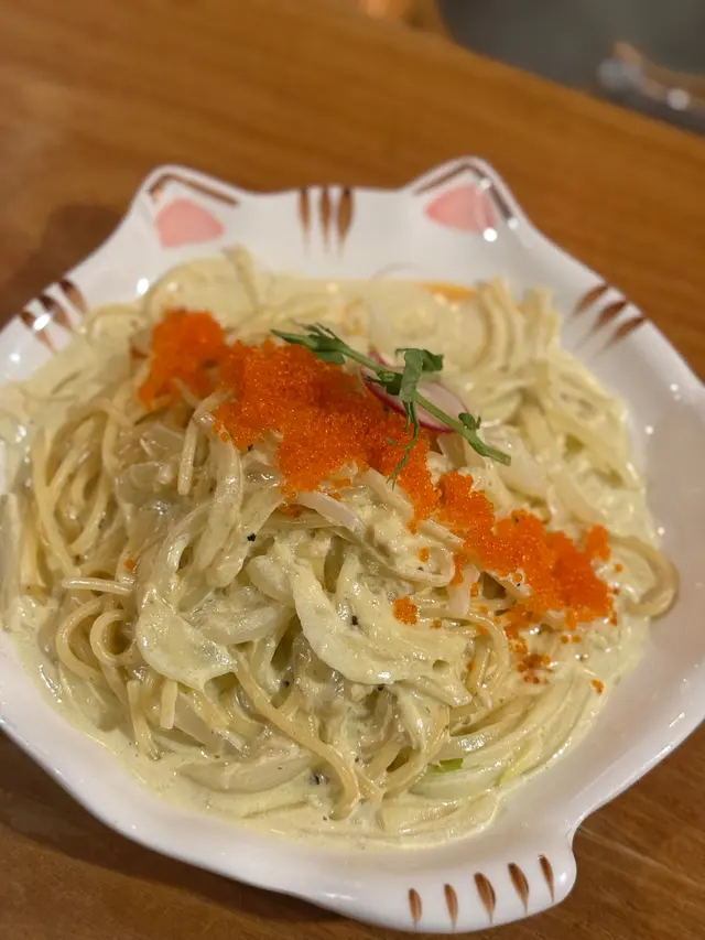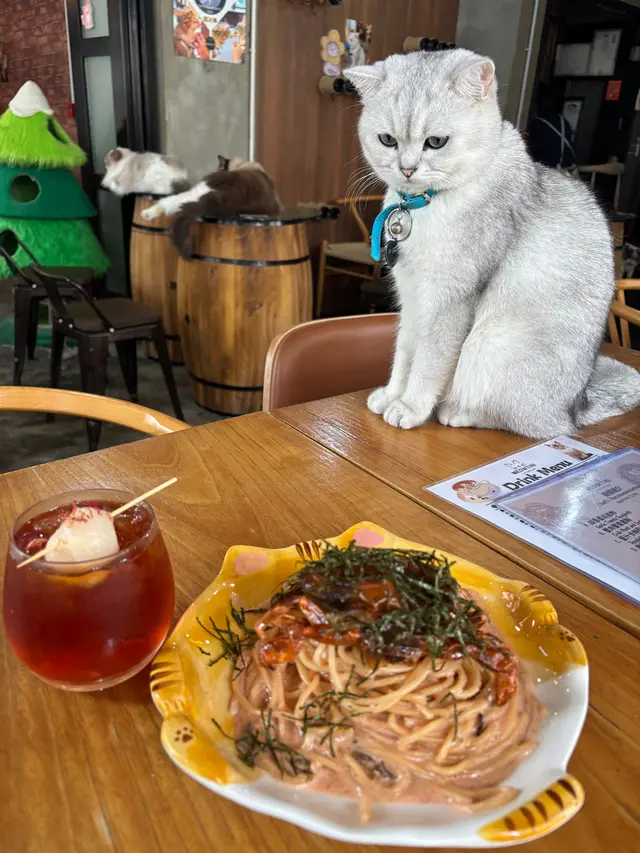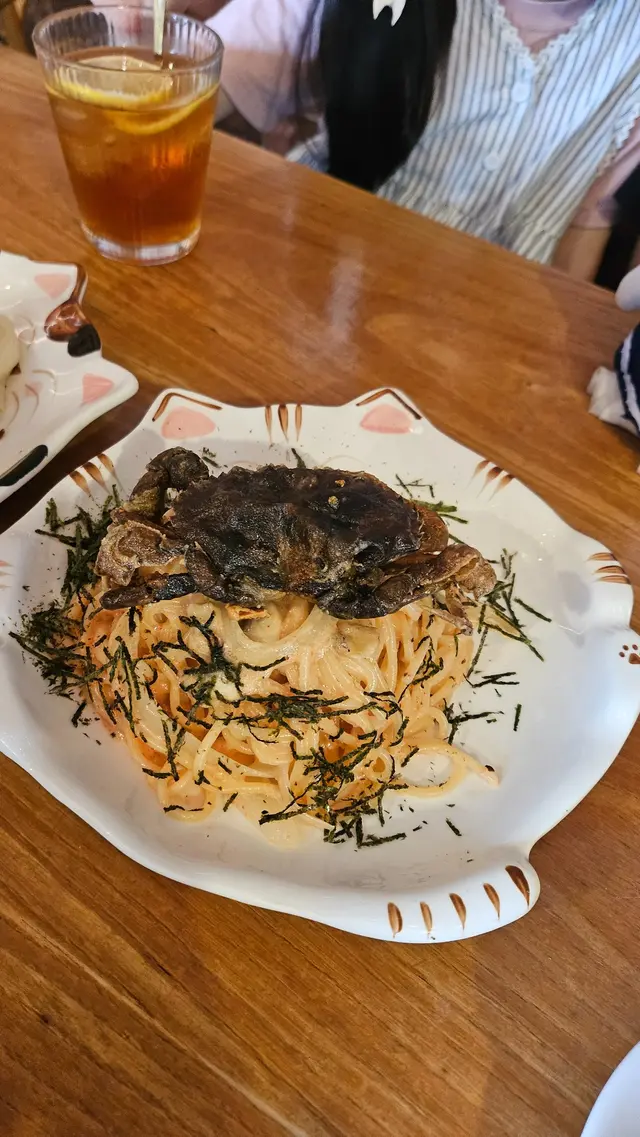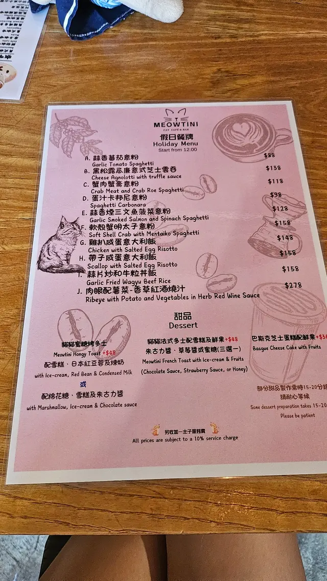 為了帶姨甥親親貓咪,預訂了位於旺角的Meowtini。正好是假日,店內是滿座狀態,所以與貓咪玩的時候,也要注意一下地方淺窄,免得影響他人或影響店員送餐。假日餐牌是單點主食,沒有套餐,但可以加錢配甜品。軟殼蟹明太子意粉有一大隻軟殼蟹鋪在意粉上,並灑上紫菜碎,軟殼蟹不夠香脆,而明太子醬的鹹鮮香辣度一般,稍嫌不夠惹味。蟹肉蟹膏意粉,面層還鋪上蟹籽,及加入蘑菇片,惟不太嚐到蟹肉香及蟹膏香濃。蒜香蕃茄意粉,簡簡單單的蕃茄意粉反而是最為惹味的一款,有蕃茄醬味也有蒜香味,只是蕃茄醬汁味道偏甜,酸香度不足。黑松露忌廉意式芝士雲吞,雲吞皮的厚薄恰好,不會覺得是厚厚粉感。餡料帶微微肉汁,不會太乾身,醬汁充滿芝士香與黑松露香,是主食之中我最喜愛的一道。貓貓蜜糖烤多士配雪糕、日本紅豆蓉及煉奶 (加$48),可愛的貓貓造型多士烤得鬆脆又滿滿蜜糖香甜。紅豆蓉配上煉奶,配呍呢嗱雪糕一起吃,感覺沒那麼甜膩。貓貓法式多士配雪糕及鮮果 (加$48),法式多士的蛋香不太明顯,而甜度恰好。榛果咖啡帶淡淡Hazelnut香氣,咖啡亦屬nutty口味,味道不錯。在那麼多食客的情況下,姨甥也有機會能與貓咪互動而覺得開心。食物水準普通,不難吃的,份量足夠,夠讓人飽肚。…查看更多