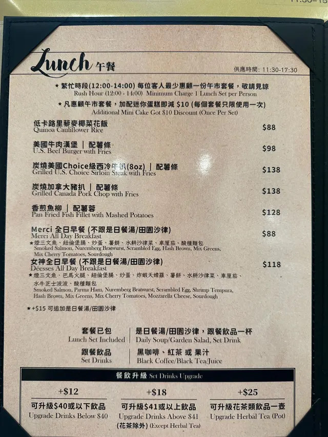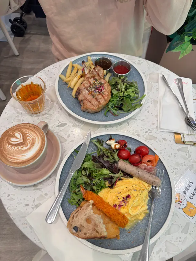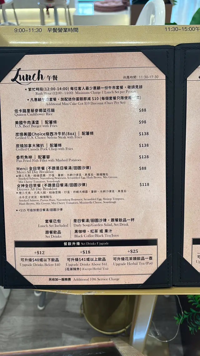 上水廣場的Merci Cafe,環境舒適,午餐選擇豐富到令人眼花撩亂!我和朋友久違重逢,決定在此享用午餐,餐牌上的菜式琳琅滿目,每道菜都吸引,令我們猶豫不決,最後我選擇了「All Day Breakfast」,而朋友則點了「炭燒加拿大豬扒配薯條」。我的All Day Breakfast份量十足,賣相精美🥗🍤🍳🧀🥔🍞🥖。煙三文魚、巴拿馬火腿、腸仔和煎蛋等食材搭配得宜,配菜也相當豐富,營養均衡。煙三文魚鮮嫩,鹹香適中;巴拿馬火腿的鹹味恰到好處,與其他食材互相輝映;腸仔煎得香脆,蛋的熟度也剛剛好。整體而言,這份早餐美味可口,令人滿足。豐富的配菜更增添了飽足感,絕對是元氣滿滿的一天開始。朋友點的炭燒加拿大豬扒配薯條同樣出色。豬扒的炭燒味香濃,肉質軟嫩多汁,火候掌握得恰到好處,不會過於乾硬,口感一流。外層微微焦香,內裡肉質鮮嫩,肥瘦比例剛好,令人回味無窮。配菜薯條炸得金黃酥脆,香氣撲鼻,與豬扒搭配得天衣無縫。總體而言,Merci Cafe的午餐質素很高,無論是食物的質量、味道還是份量,都令人非常滿意。服務態度也很好,店員親切有禮,環境舒適,適合朋友聚會或情侶約會。價格方面亦算合理,性價比高。下次有機會,我一定會再來嘗試其他菜式,例如意粉、沙律等等,相信都能帶給我同樣的驚喜。強烈推薦給各位食家!查看更多