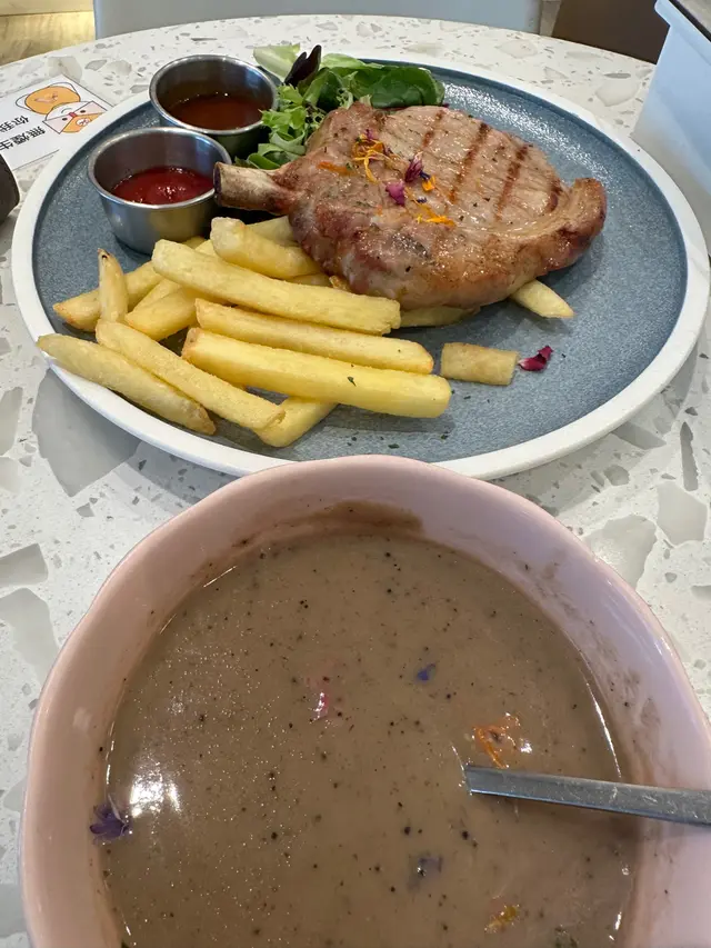 職員服務好會細心講解餐牌坐位隔離較濶是日精選蘑菇湯好飲用炭燒整厚切豬扒,豬扒切開仲係淺粉紅,好嫩好好食😋個燒汁仲係自調的,正👍咖啡都好飲,較Nutty 我鍾意值得推介查看更多