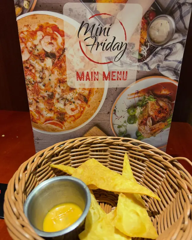 I was randomly searching for cafes or restaurants which allowed to sit long for this Saturday friends reunion. Recalling someone recommended Mini Friday where serving economical variety food with comfortable seats. I booked it via open rice with a promotion on lunch set. Restaurant was pretty empty that allowed us to pick wherever seats we wanted. Menu covered different kind of food such as breakfast, rolls, burgers, salad, pasta, desserts etc. We made our order via QR code requesting a pepperoni parma ham pizza, roasted half chicken and laksa spaghetti with fan scallop. Additionally having a baked cauliflower with cheese as appetiser. Pepperoni parma ham pizza came first. It was a crispy thin crust type. Freshly made. Crispy crust. Appreciated topping with arugula for some bitterness and peppery, while it would be nicer if more generous on it. Parma ham was on a lean side giving some chew and pepperoni added a strong meaty saltiness. Not bad.Baked cauliflower was boiling hot. Love the top burnt cheese marks which gave extra charred flavour. Cauliflower and broccoli were served. Kept its crunch while absorbed so much of the creaminess. A heavy one but delicious. The only flaw was that sauce was very watery. Only those covered on the cauliflowers were thickened, bottom ones were personally too wet.Roasted half chicken was served with green beans and mashed potato. First glimpse definitely was their split gravy. The two layers split gravy was visually seen and becoming more obvious when time passed. Anyway, chicken was moist and herbed. Sauce was kind of unnecessary or I may ask for omitting next time. Green beans were crunchy and sweet. Mashed was smooth but not my favourite. We couldn't finish it at last. Laksa spaghetti was unexpectedly the most delicious dish this afternoon. It was in a comparably big portion. We all three refilled two times we still haven't finished it. Scallop was surprisingly big. Love the laksa sauce that not just spicy, it's a combination of south east asian spice mix with sweet juicy mushrooms and zucchinis. Spaghetti was cooked perfectly. Really not bad. We ended up seated for more than 3 hours with water kept refilling even we had our own set drinks. Really a good place for a long chill accompany with something to nibble. 查看更多