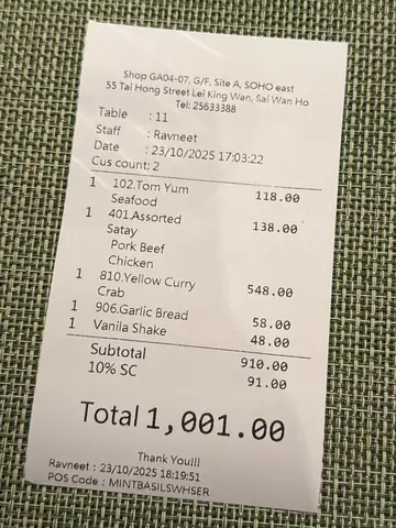 太古坊上班族放工想揾间餐厅食野chill下同朋友闲聊, 选择了沿海鲤景湾一带餐厅, 呢间主打泰国菜餐厅, 胜在人流唔多, 冇限时用餐, 可以慢慢relax食个dinner。餐厅开扬, 面向海景, 稍有些少微风, 感觉更写意。【冬荫功汤with seafood】HK$118非常丰富足料, 大量海鲜, 包括有大大只虎虾、青口、半刺身口感嘅带子、好爽口嘅墨鱼须, 配上泰式香料, 令整个冬荫功汤更升华, 味道浓郁, 甜酸带辣, 惹味开胃, 两个人share岩岩好。【串烧沙爹】HK $138分别有齐猪、牛、鸡各两串, 每串都几厚肉几大串, 表面烧得香口keep到肉汁, 其中鸡较为出色, 肉质嫩滑, 另外牛同埋猪都几有肉香, 沾上沙爹酱食, 正啊!【泰式黄咖哩炒蟹】HK$548大大盘黄咖哩几乎覆盖了整只蟹, 蟹切件而且泡过油, 更易挂上黄咖哩汁, 蟹肉偏林, 但最出色系个黄咖哩, 香甜浓郁兼富有蛋香味, 绝对要order个蒜蓉包/叫个饭黎捞汁食, 简直一流! 【蒜蓉包】HK $58烘得松脆, 沾上了蒜蓉, 香口惹味。【Vanilla Shake】HK$48意为系奶昔, 但原来系杯沙冰, 云呢拿味偏淡。…查看更多